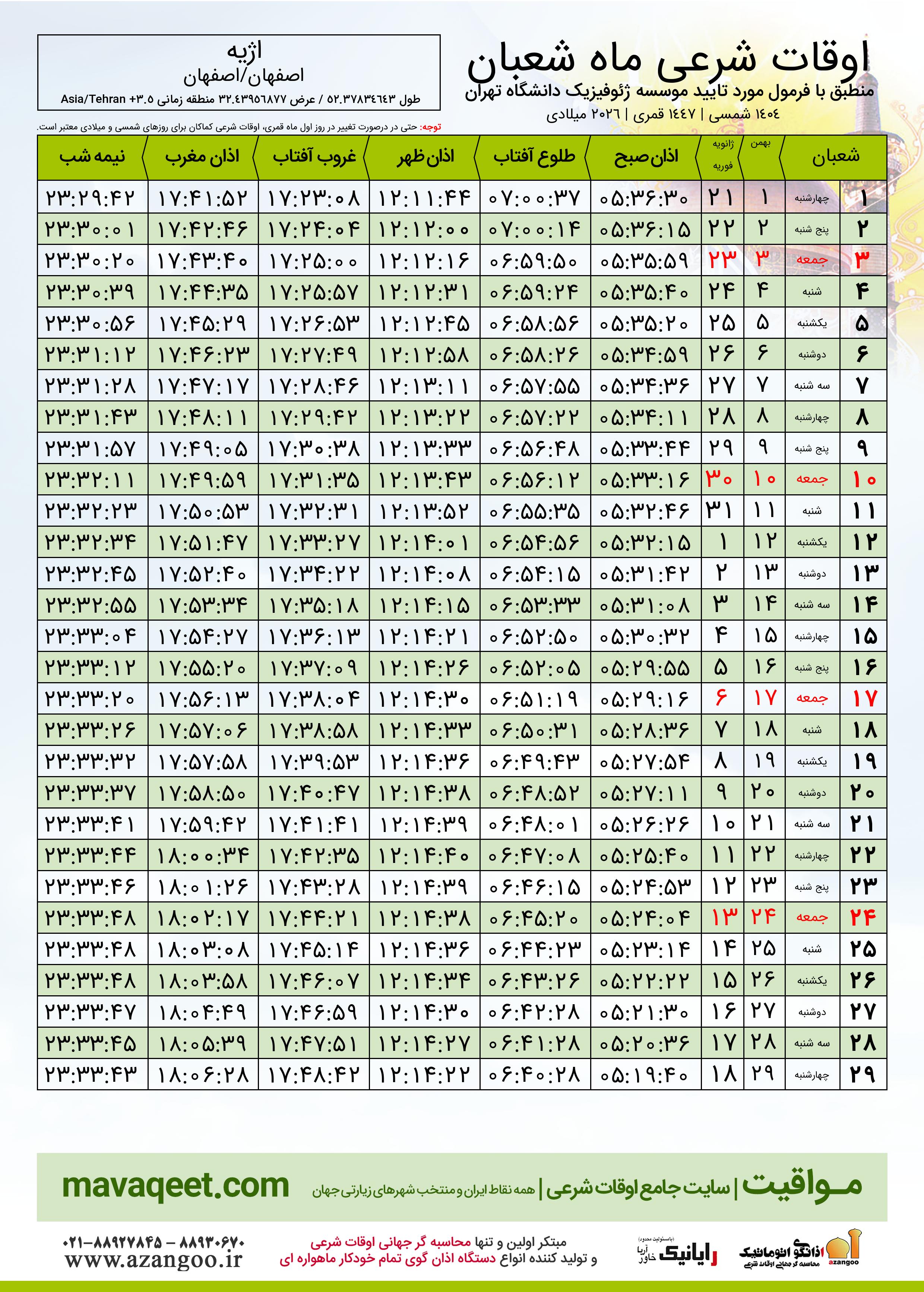 اوقات شرعی ماه شعبان ١٤٤٧ هـ.ق شهر اژیه بر