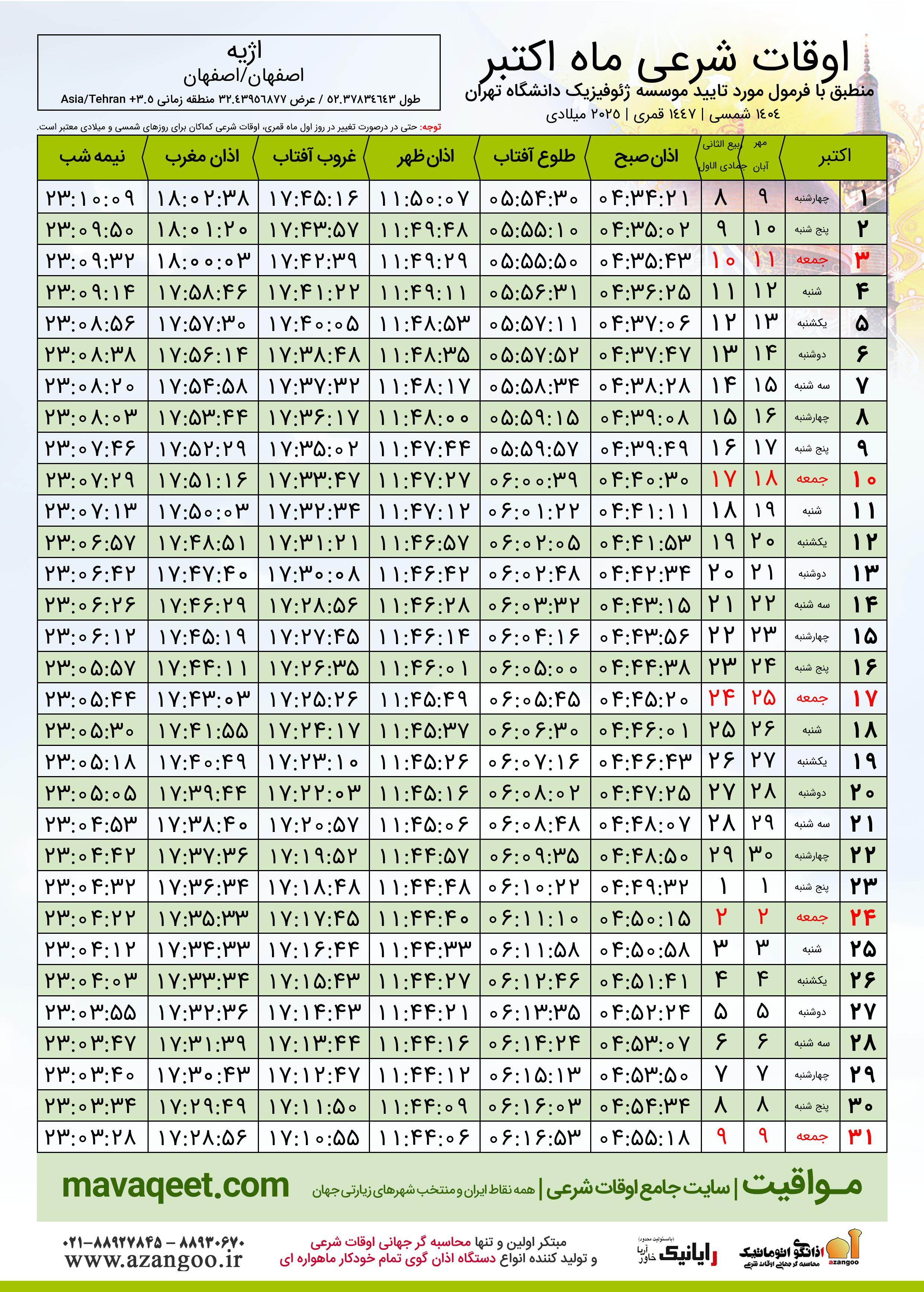 جدول اوقات شرعی اکتبر ٢٠٢٥ میلادی شهر اژیه