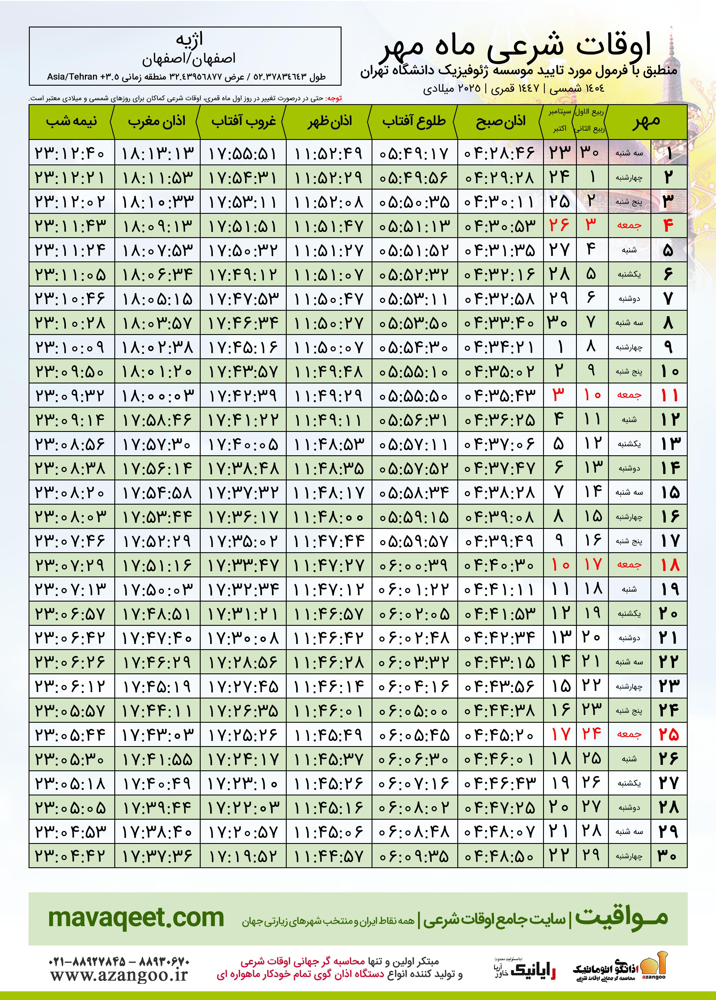 دانلود اوقات شرعی مهر ٠٤ - ١٤٠٤ شهر اژیه
