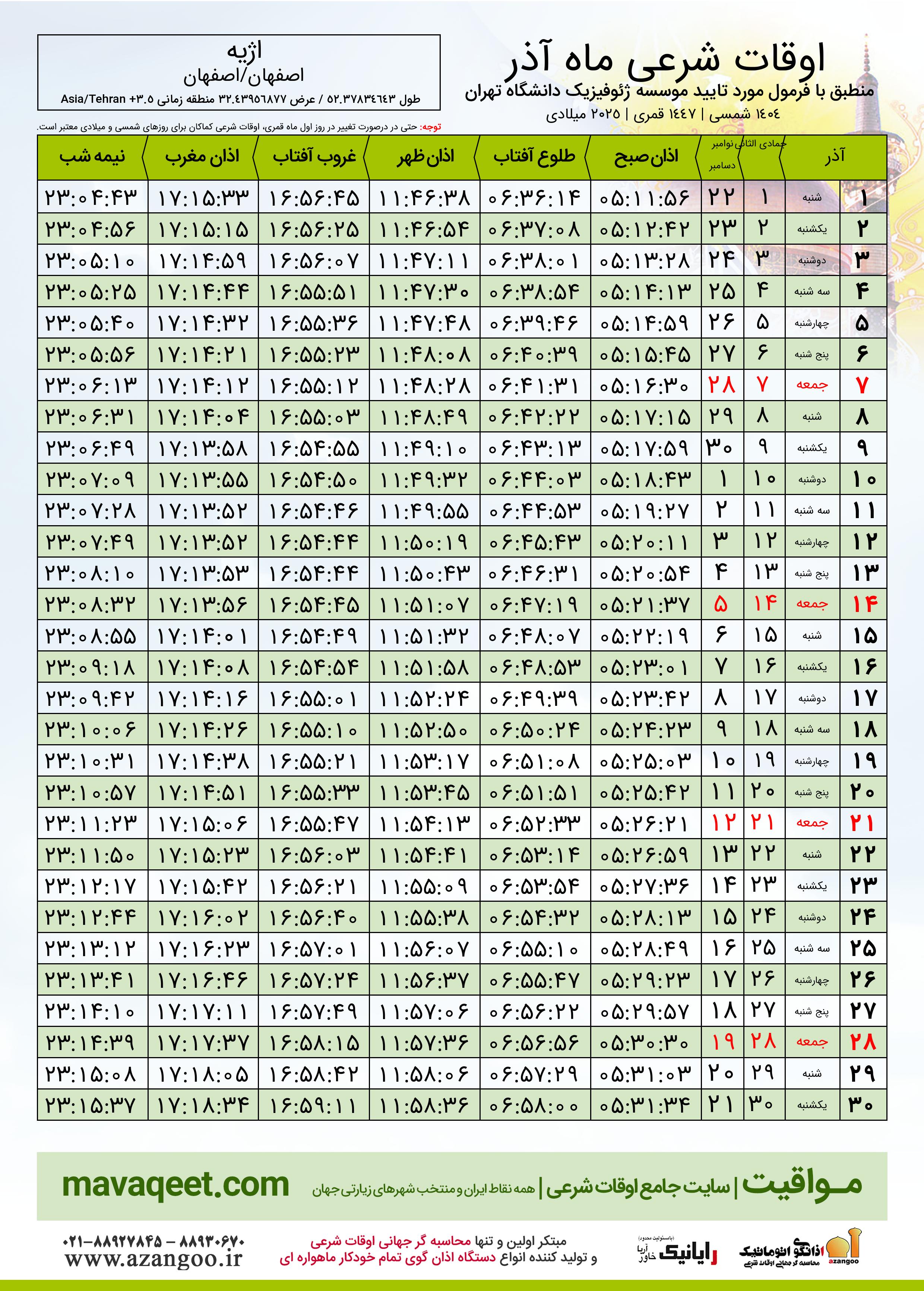 | ٢٠ آذر ١٤٠٤ | ٠٥:٢٥:٤٢ | ٠٦:٥١:٥١ | ١١:٥٣:٤٥ | ١٦:٥٥:٣٣ | ١٧:١٤:٥١ | ٢٣:١٠:٥٧ |