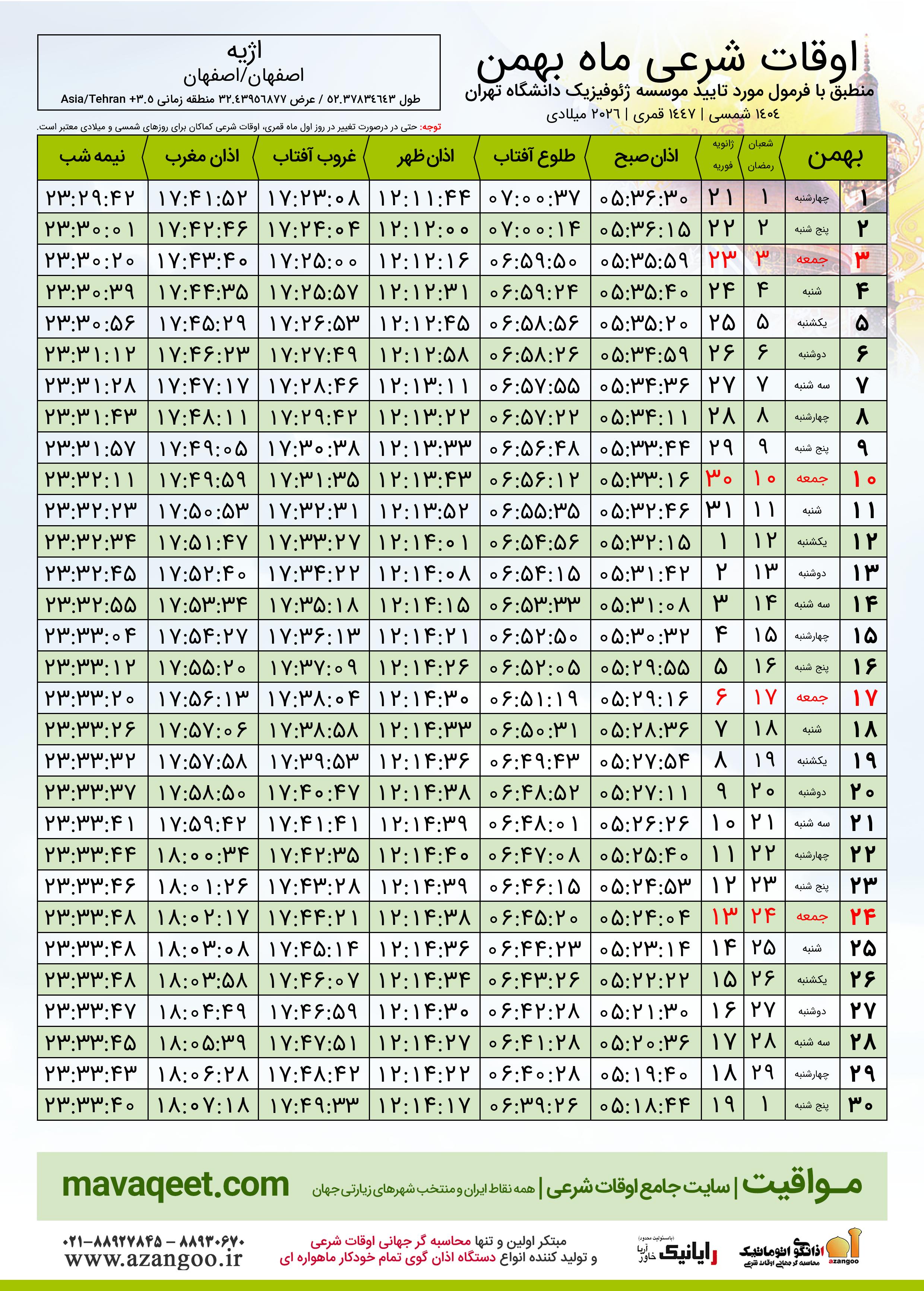 | ١١ بهمن ١٤٠٤ | ٠٥:٣٢:٤٦ | ٠٦:٥٥:٣٥ | ١٢:١٣:٥٢ | ١٧:٣٢:٣١ | ١٧:٥٠:٥٣ | ٢٣:٣٢:٢٣ |