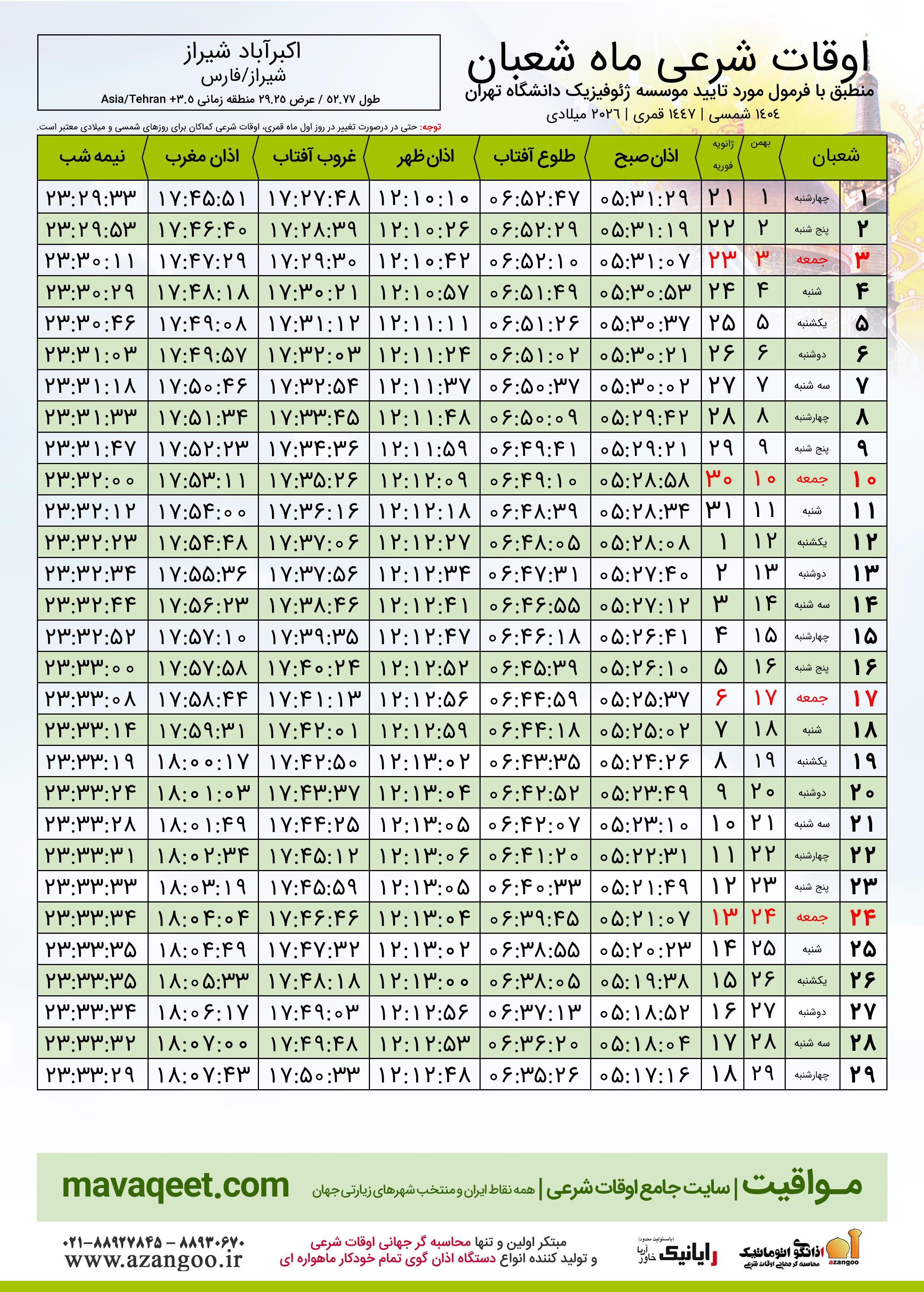 اوقات شرعی ماه شعبان ١٤٤٧ هـ.ق شهر اکبرآباد شیراز بر