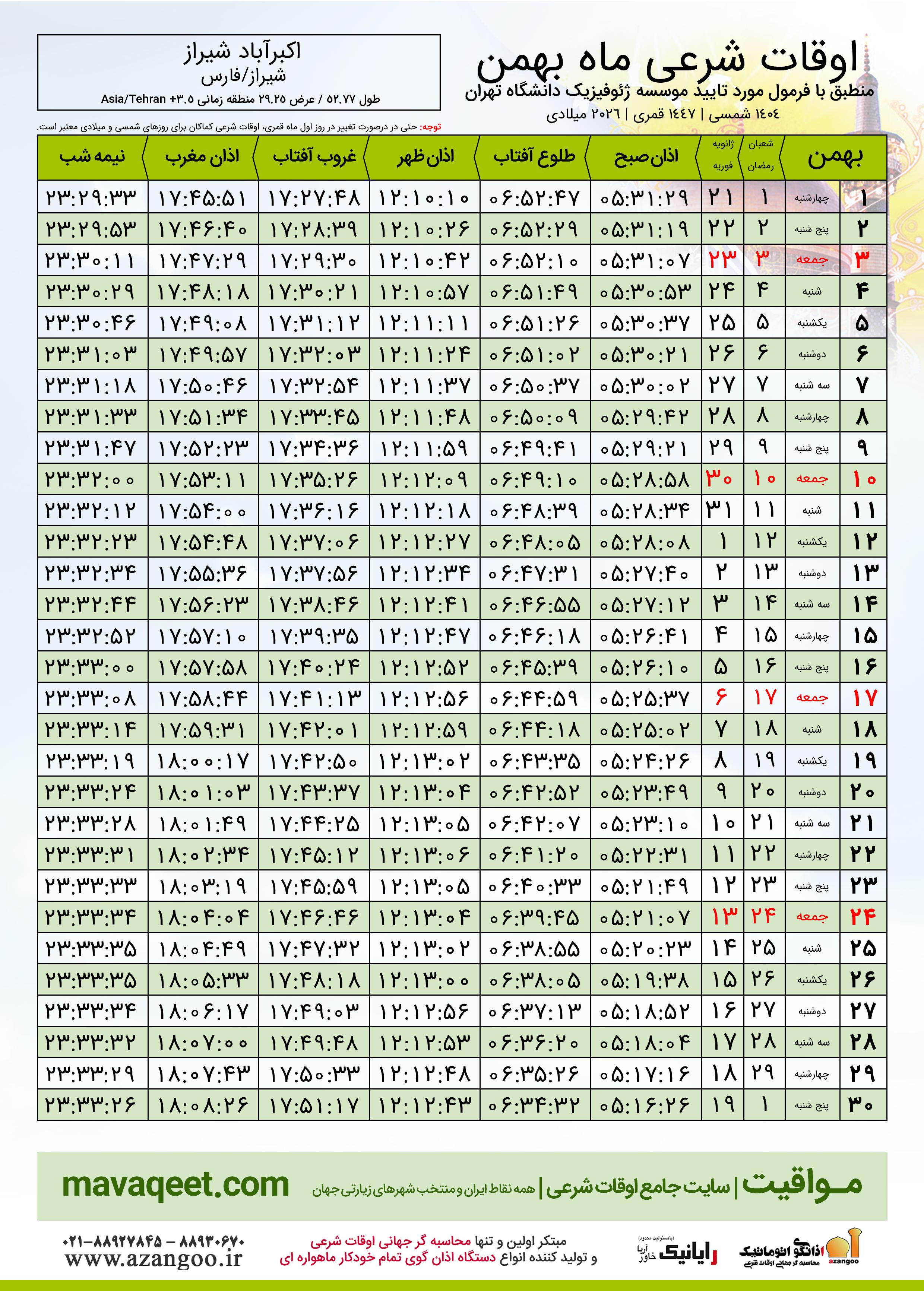 دانلود اوقات شرعی بهمن ٠٤ - ١٤٠٤ شهر اکبرآباد شیراز