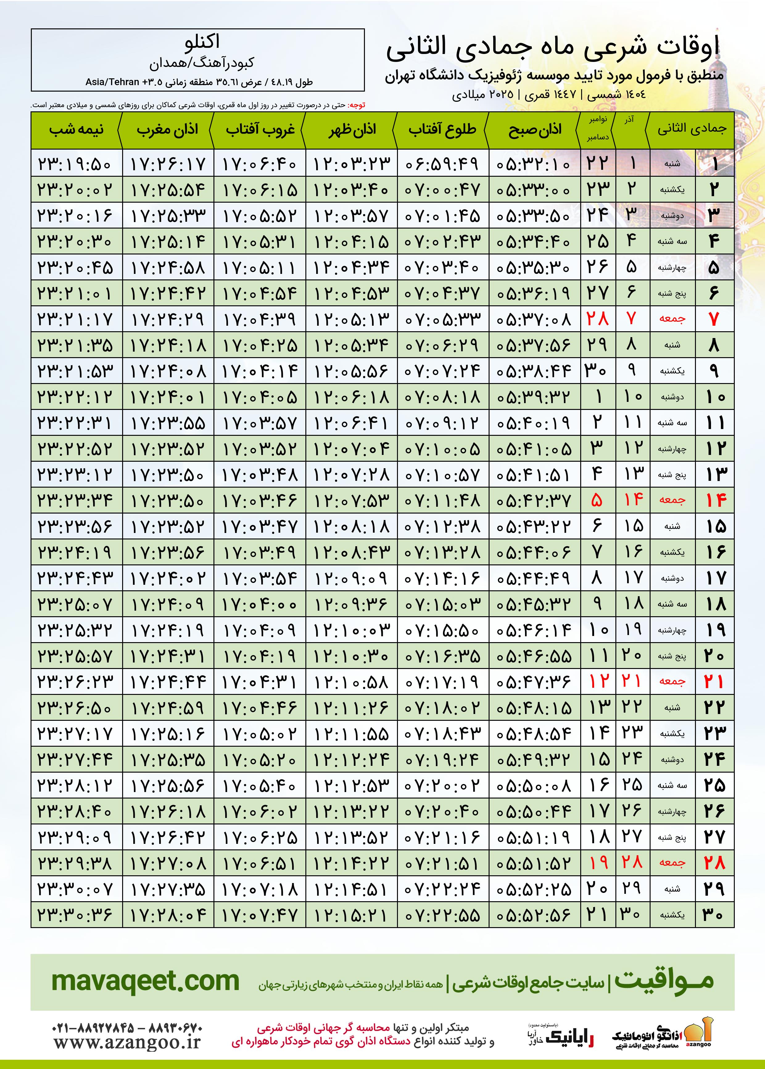 جدول اوقات شرعی جمادی الثانی ١٤٤٧ قمری شهر اکنلو