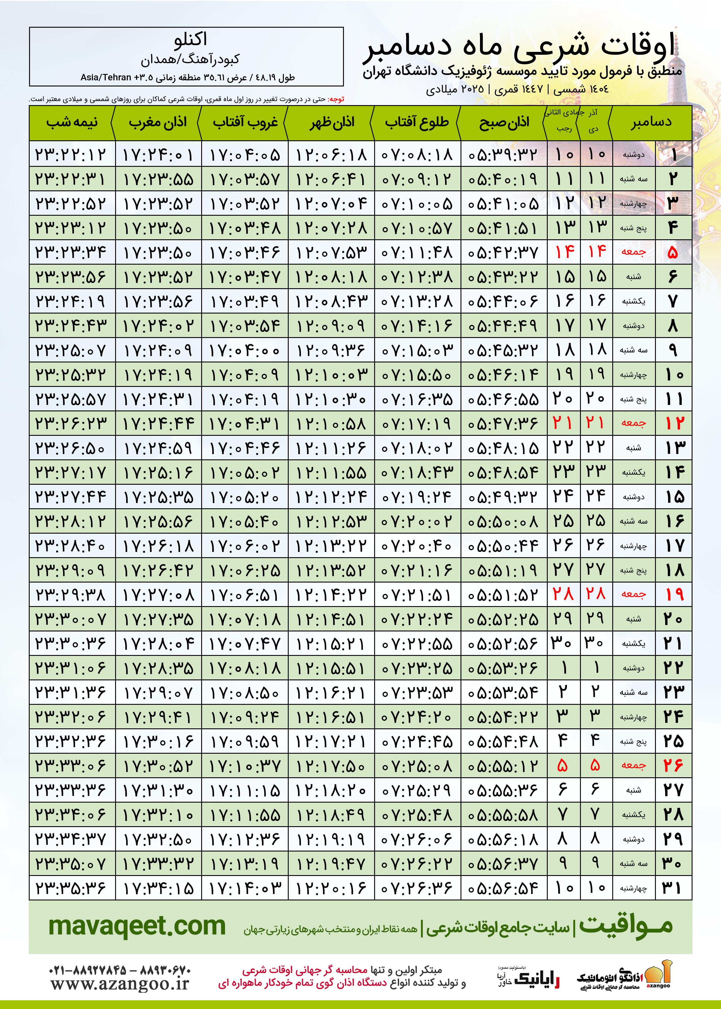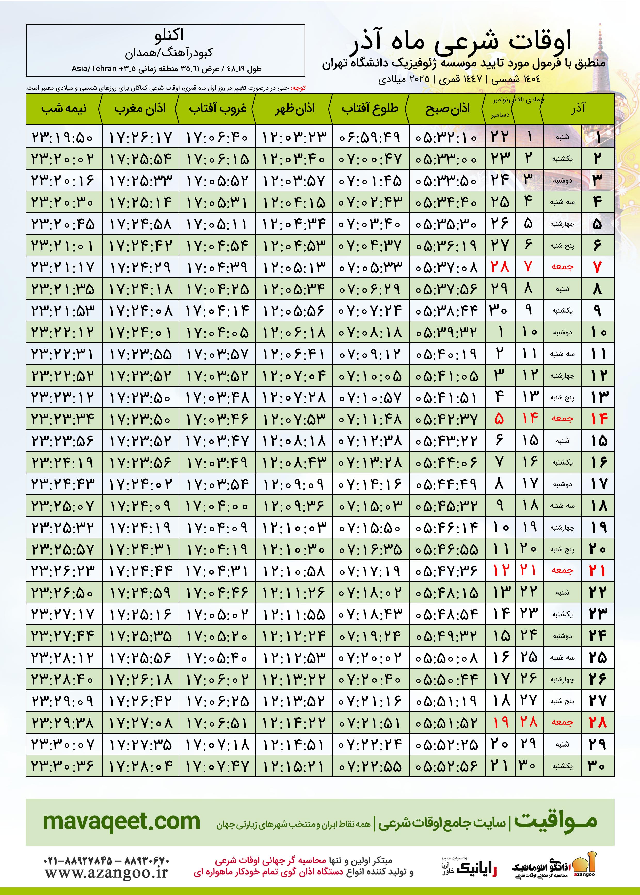 جدول اوقات شرعی آذر ١٤٠٤ شمسی شهر اکنلو