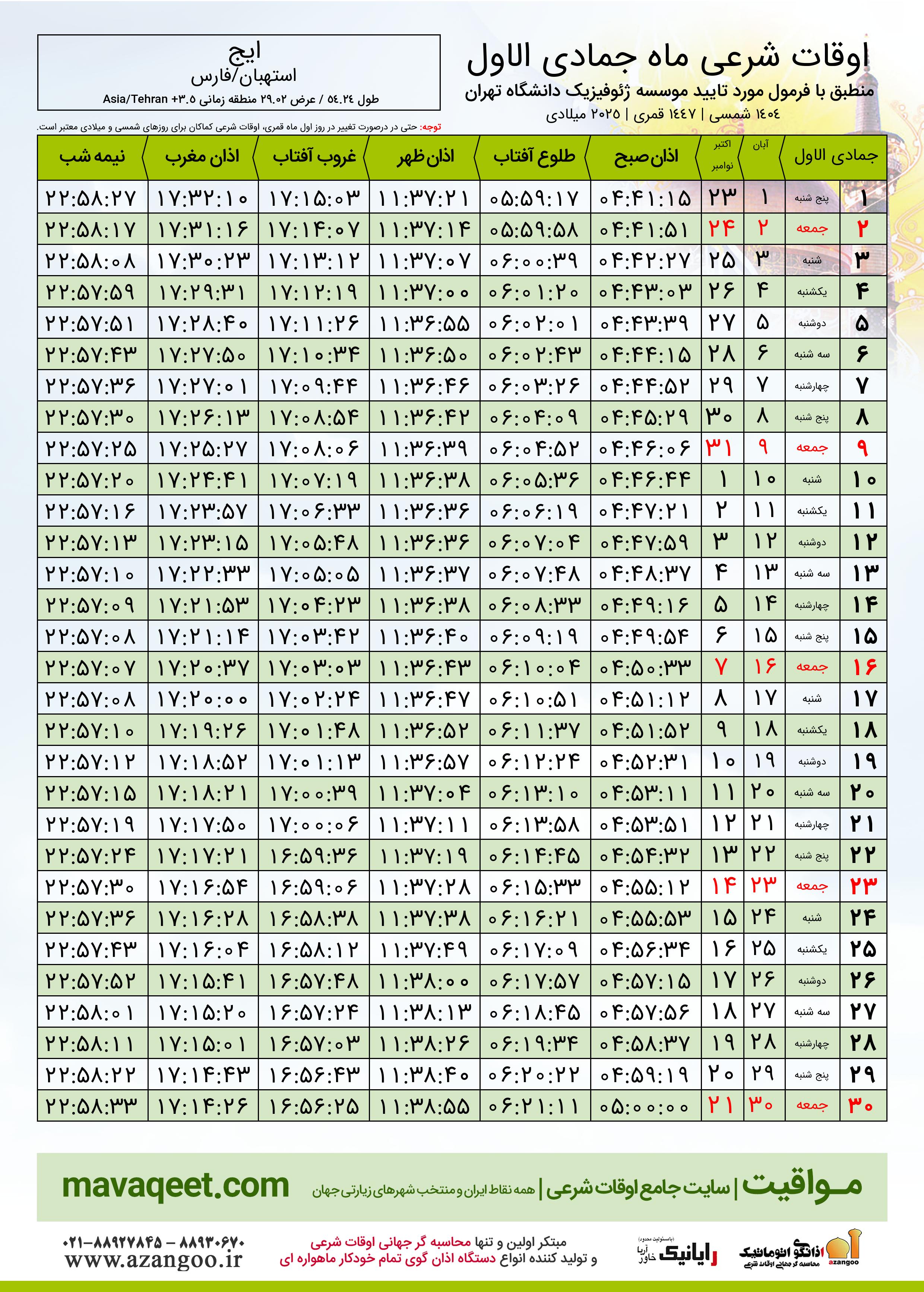 جدول اوقات شرعی جمادی الاول ١٤٤٧ قمری شهر ایج