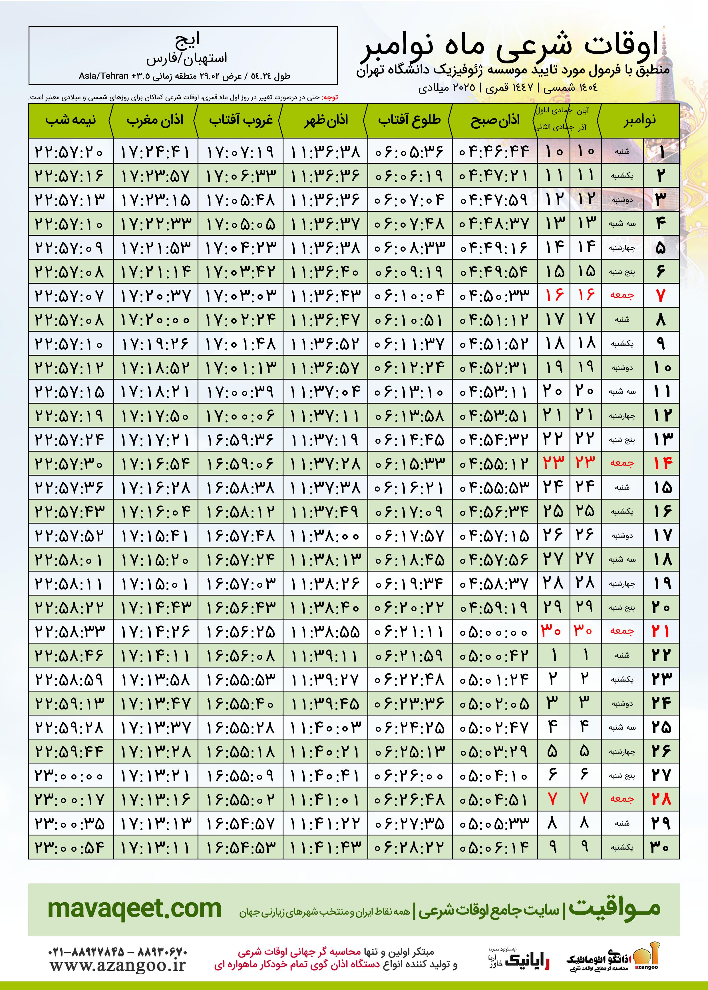 جهت نمایش تصویر جدول اوقات شرعی جدول اوقات شرعی آبان ١٤٠٤ شمسی شهر ایج شهر ایج در اندازه