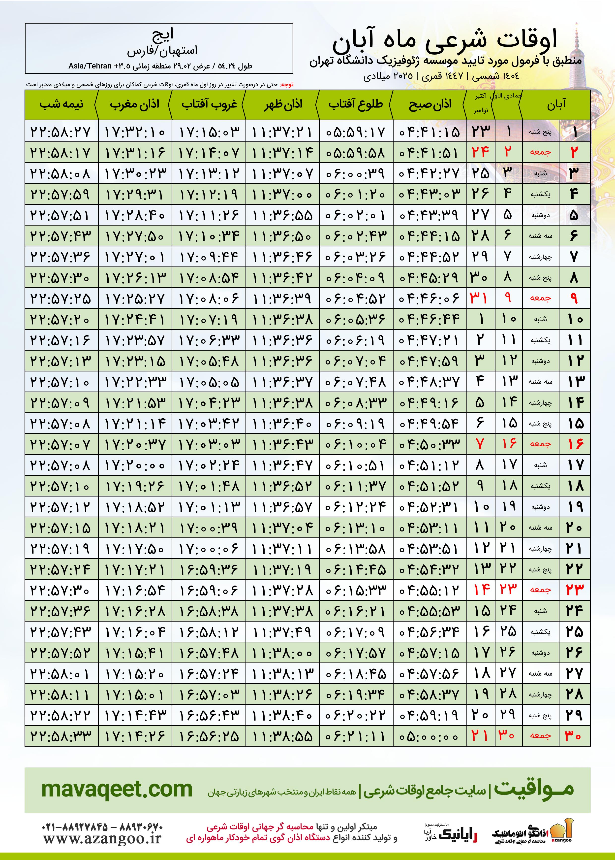 جدول اوقات شرعی آبان ١٤٠٤ شمسی شهر ایج