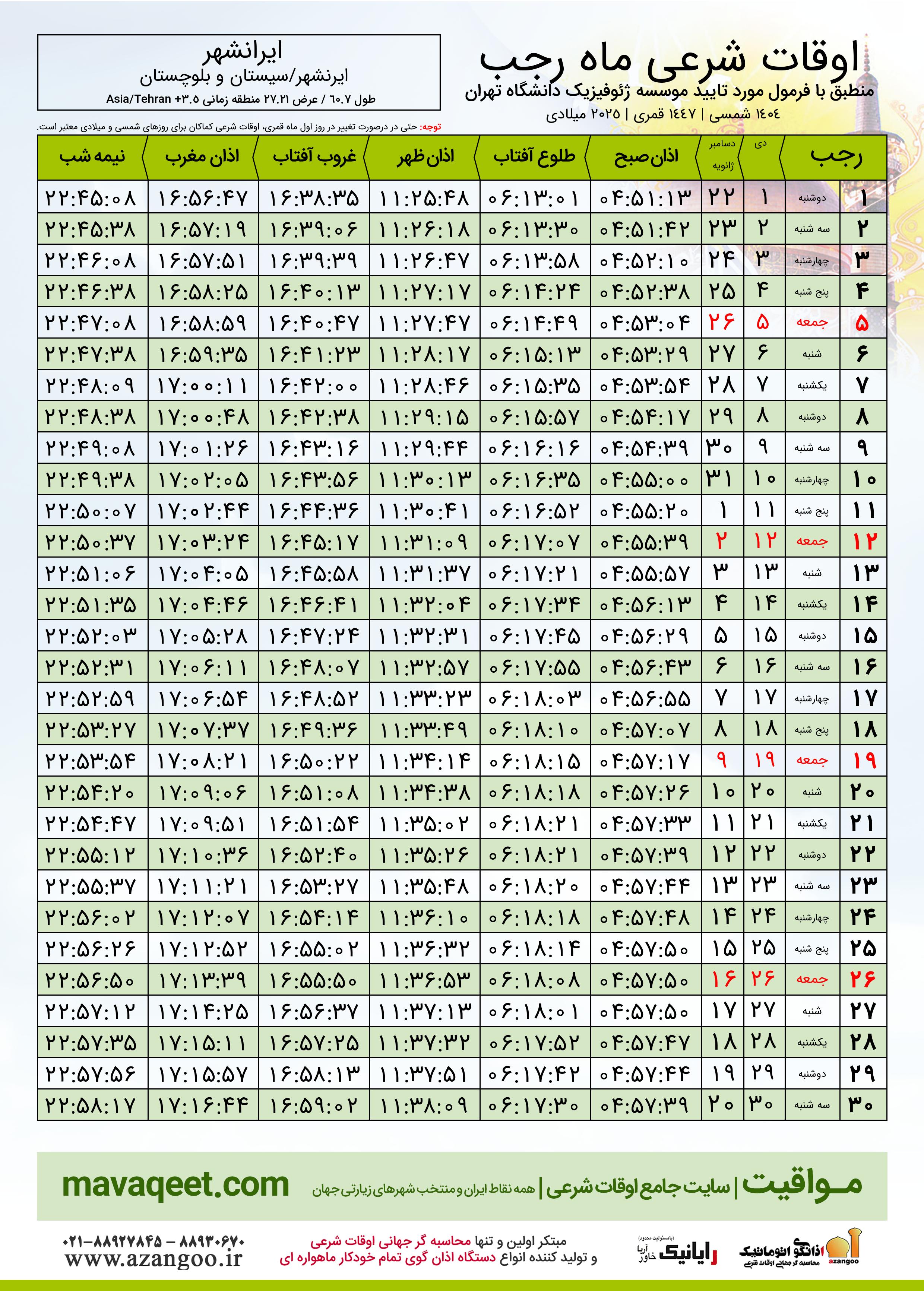 اوقات شرعی ماه رجب ١٤٤٧ هـ.ق شهر ایرانشهر بر