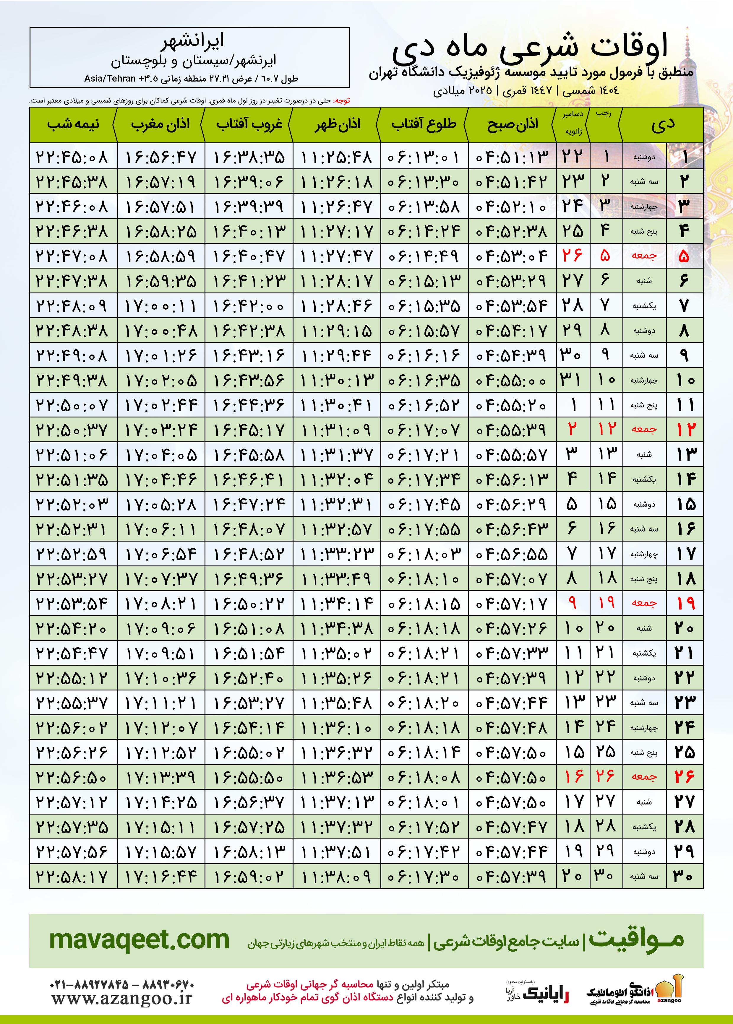 اوقات شرعی دی ١٤٠٤ شمسی شهر ایرانشهر