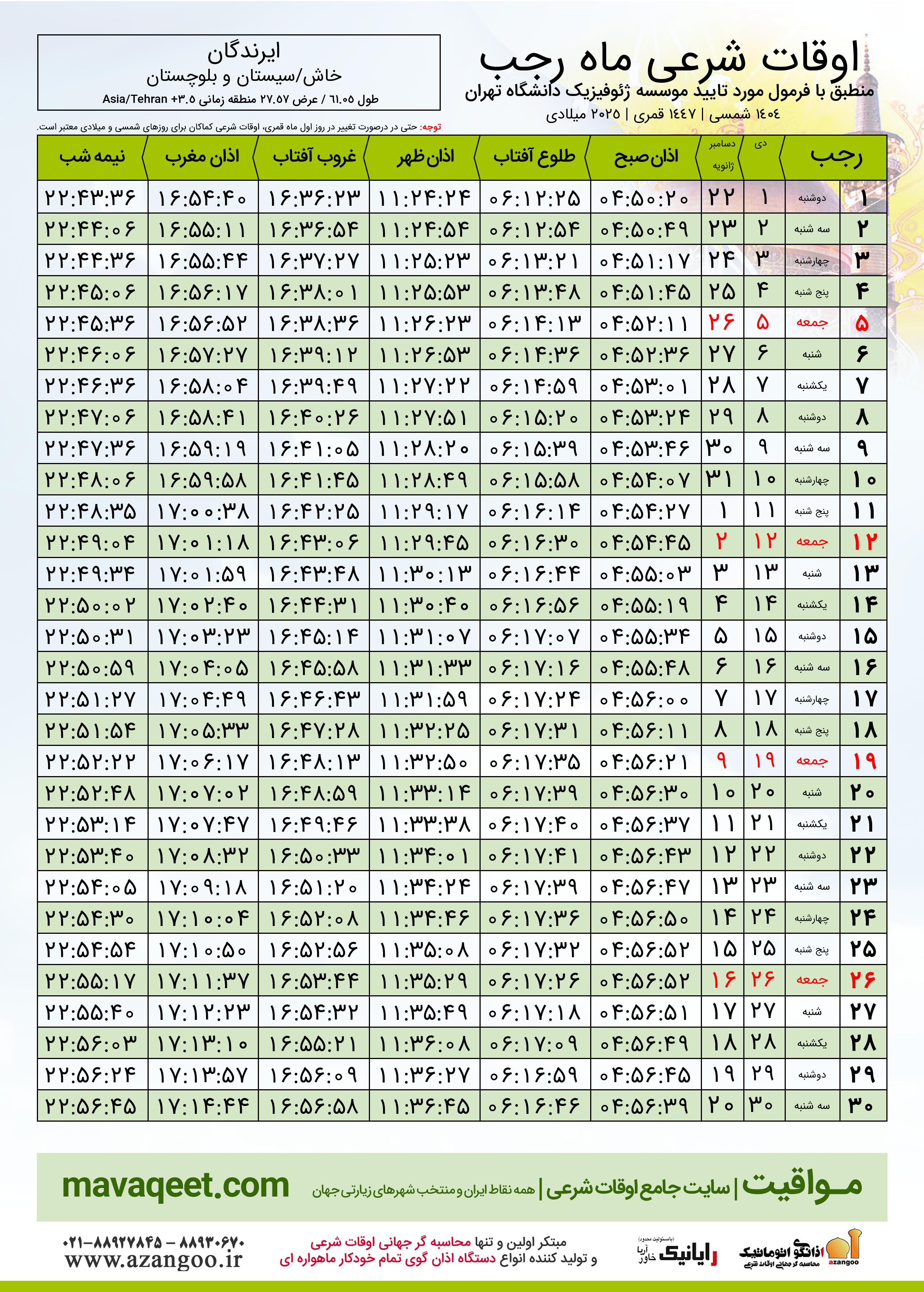 اوقات شرعی ماه رجب ١٤٤٧ هـ.ق شهر ایرندگان بر