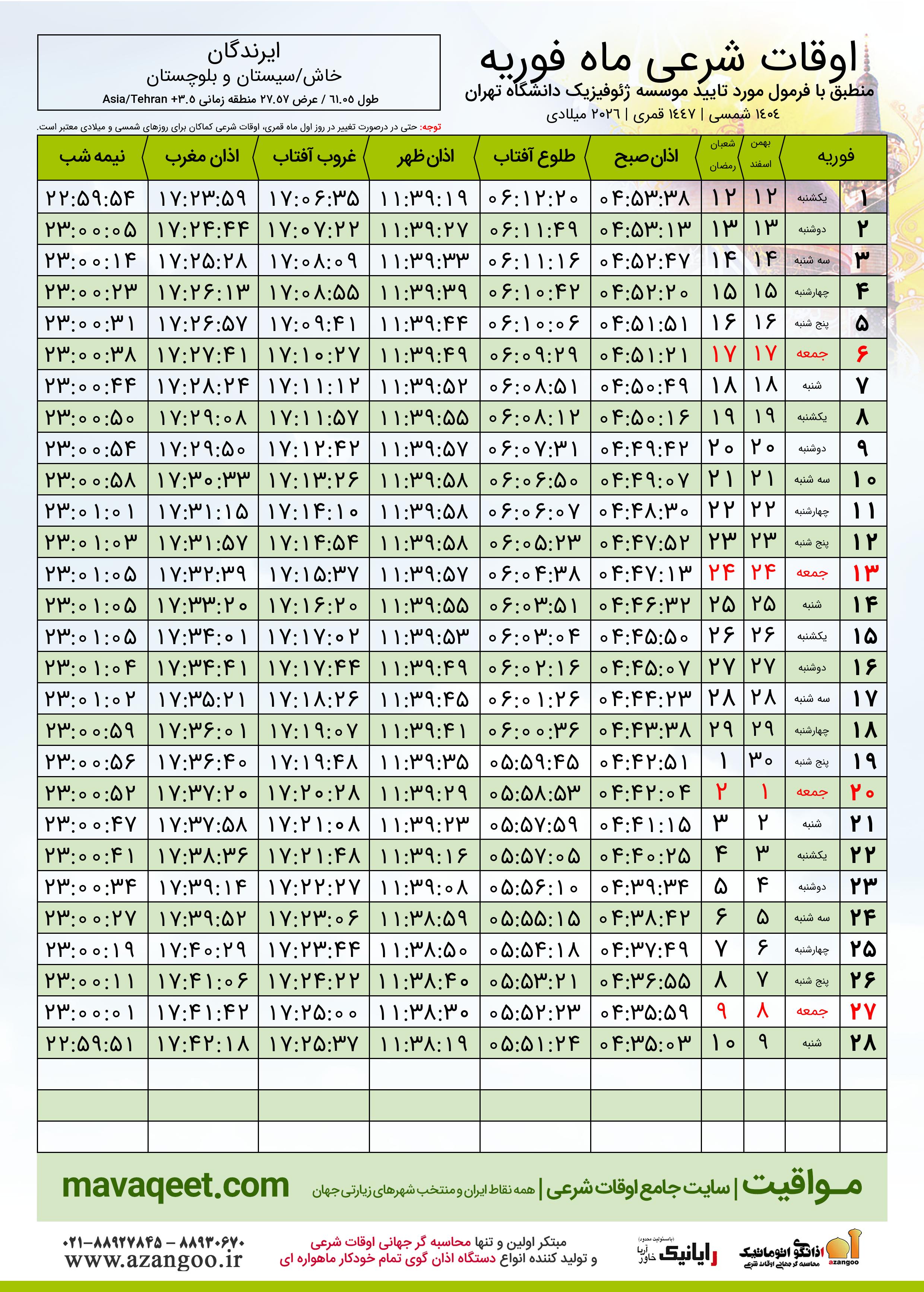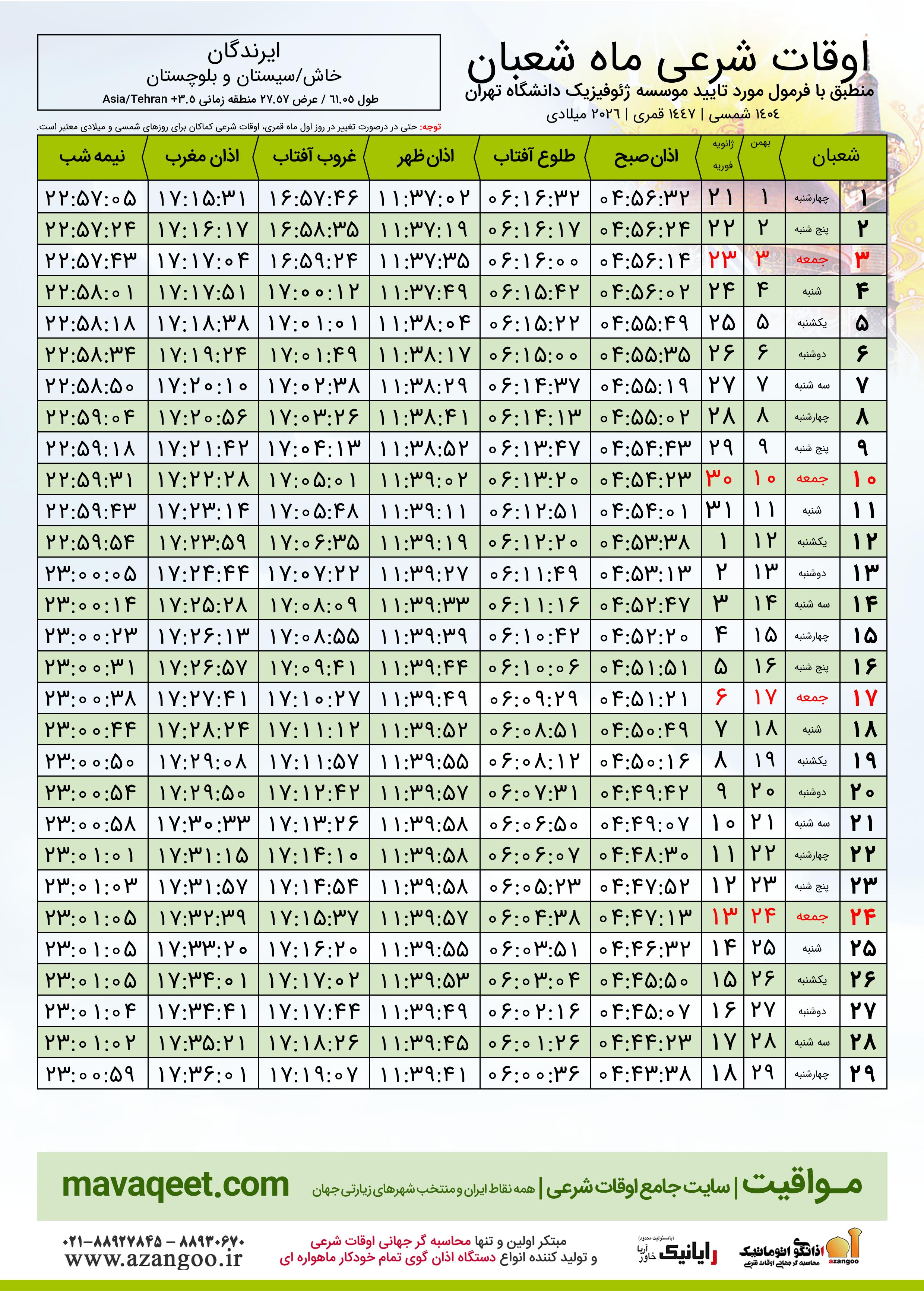 اوقات شرعی شعبان ١٤٤٧ شهر ایرندگان + دانلود