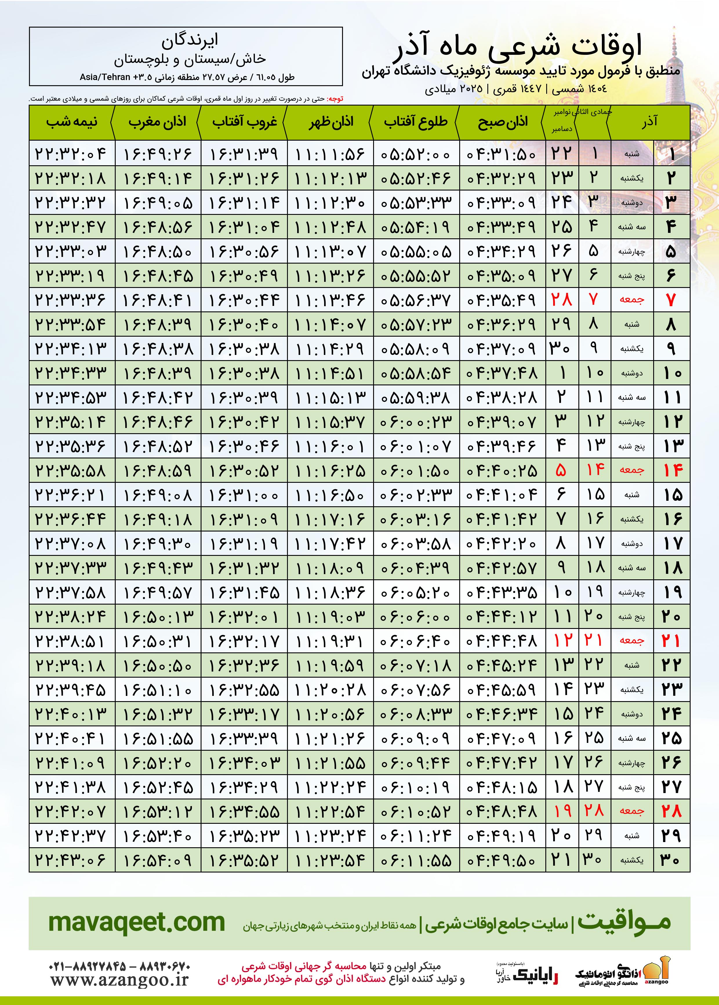 جدول اوقات شرعی آذر ١٤٠٤ شمسی شهر ایرندگان