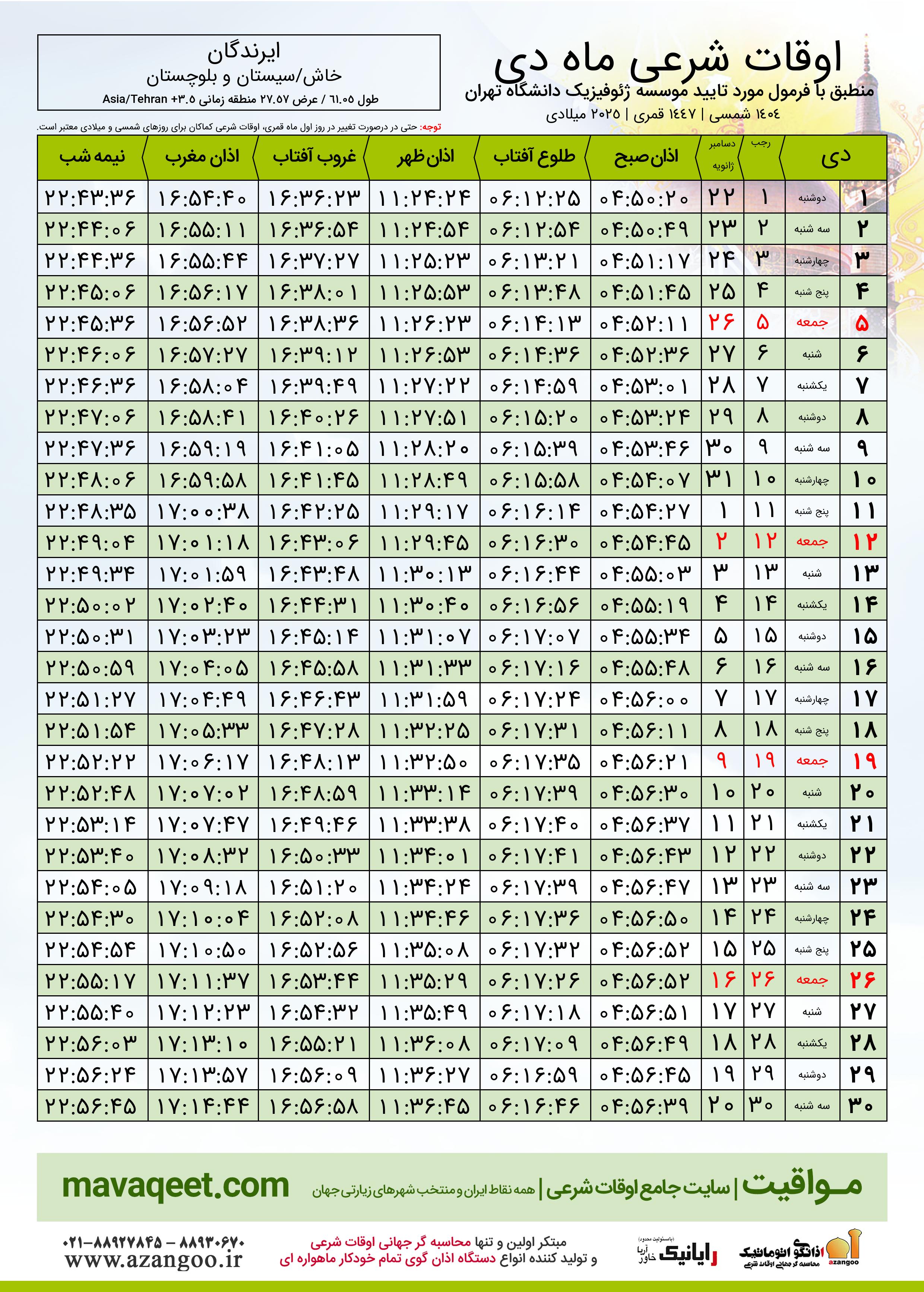 اوقات شرعی دی ١٤٠٤ شمسی شهر ایرندگان