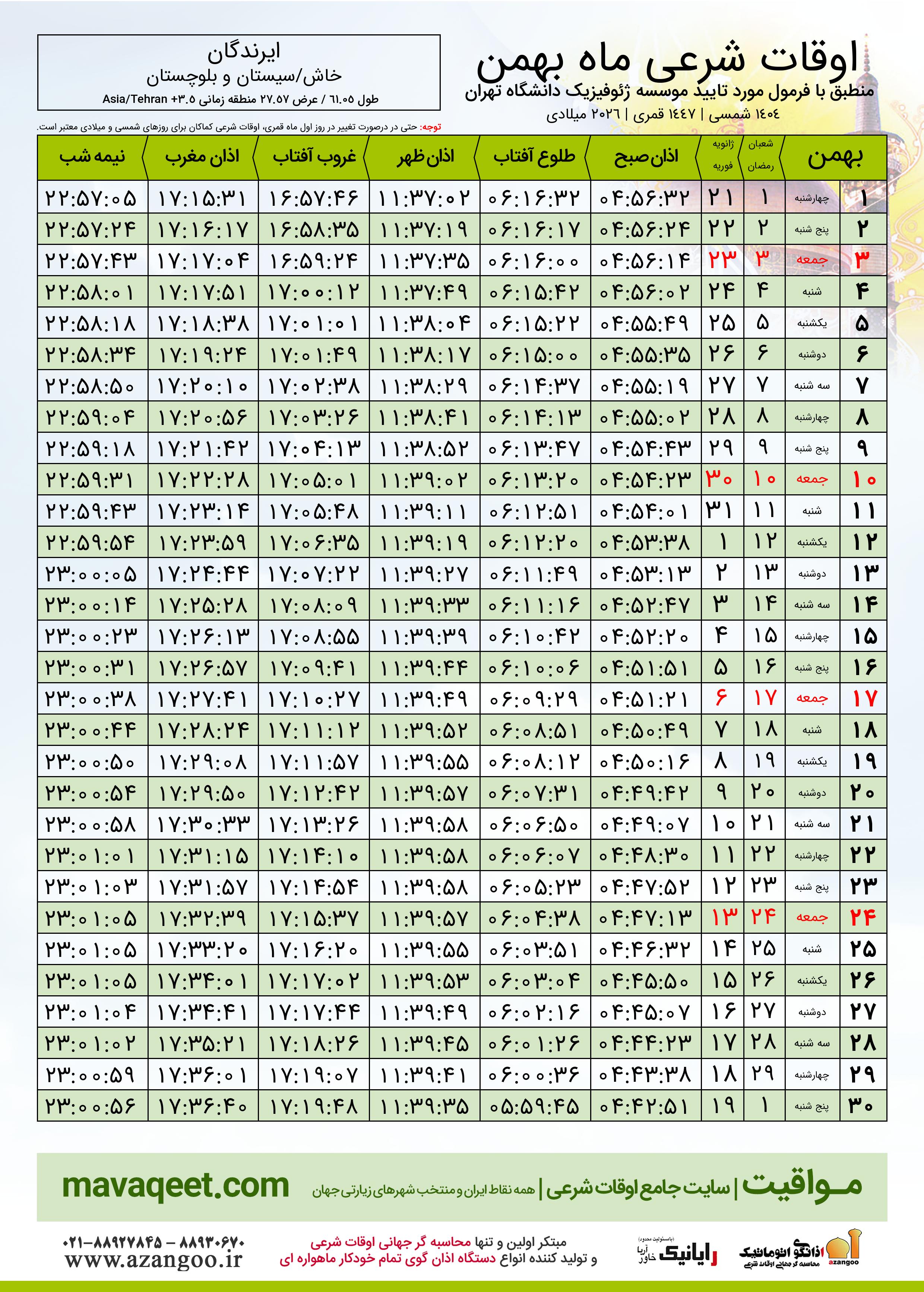 دانلود اوقات شرعی بهمن ٠٤ - ١٤٠٤ شهر ایرندگان