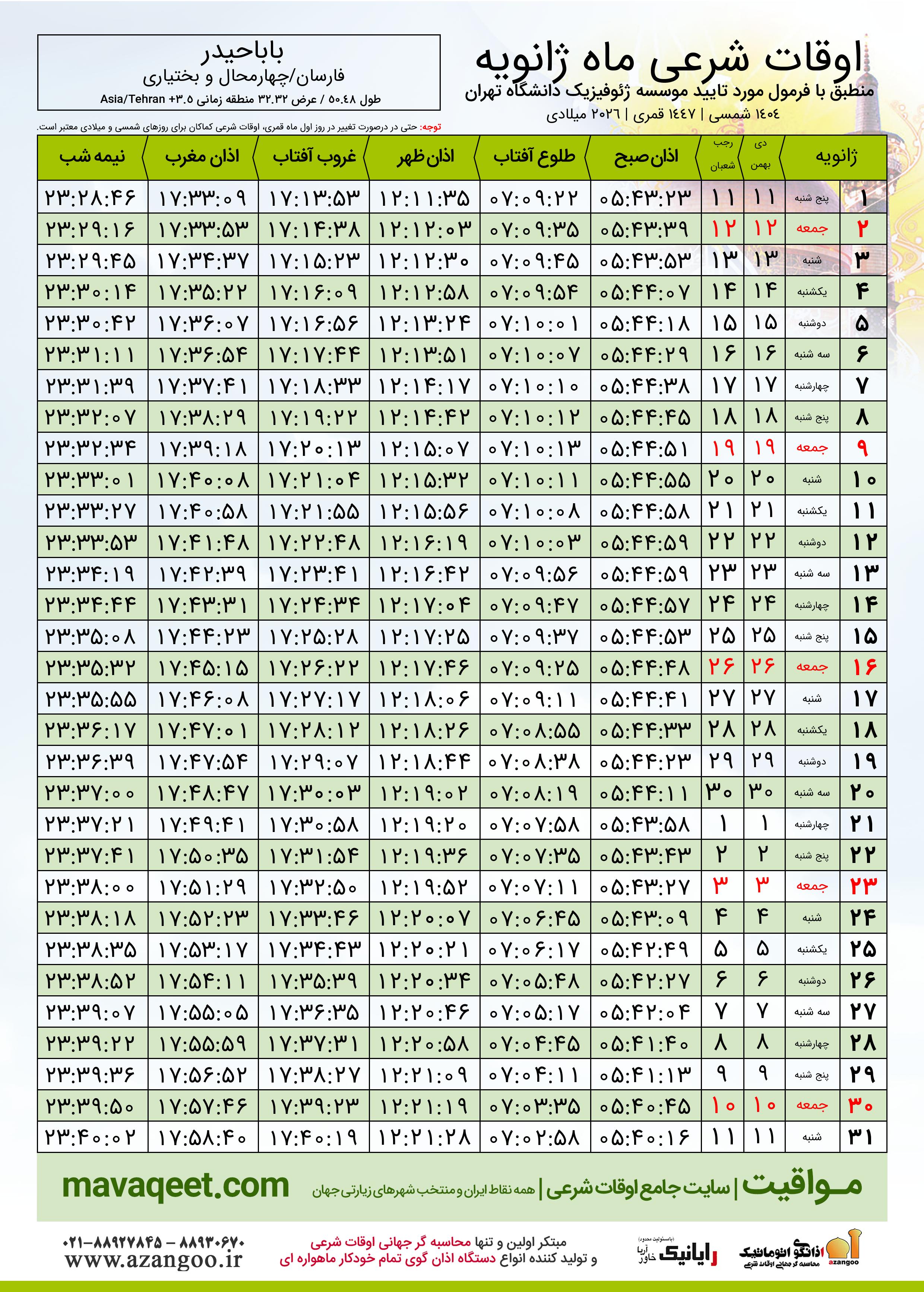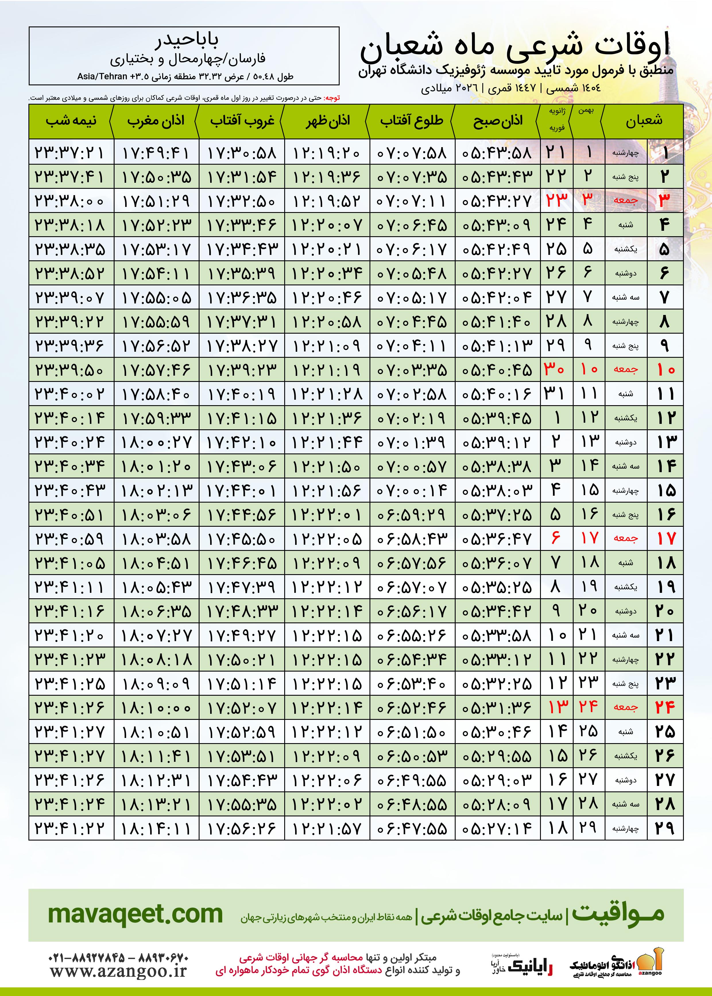 اوقات شرعی ماه شعبان ١٤٤٧ هـ.ق شهر باباحیدر بر