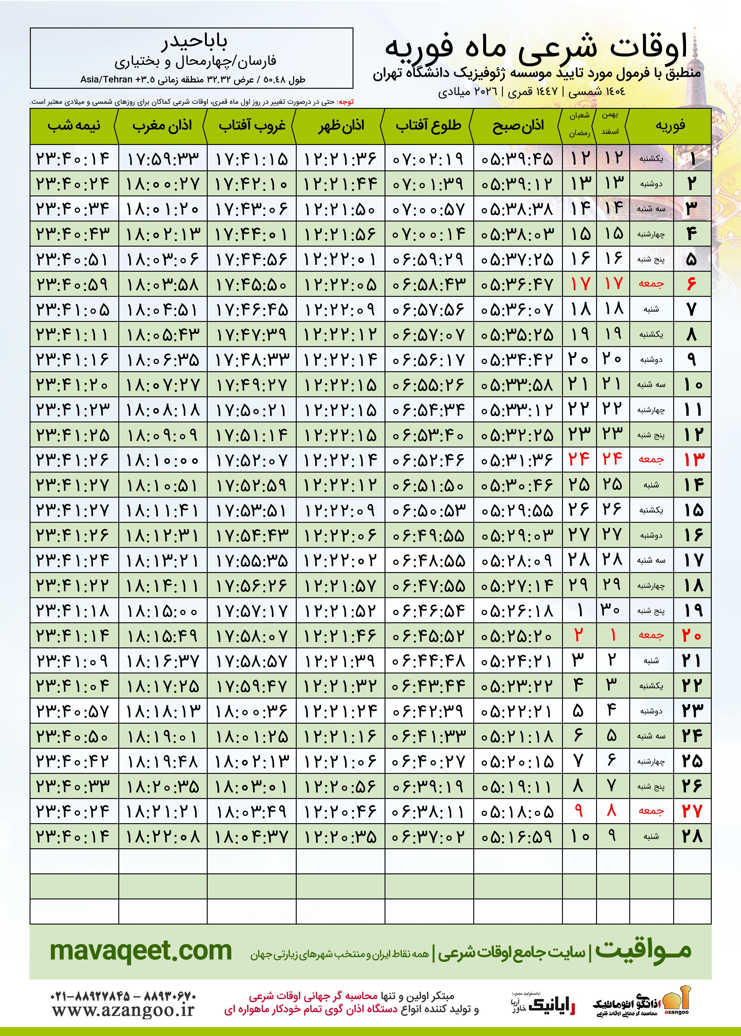 دانلود اوقات شرعی فوریه ٢٠٢٦ شهر باباحیدر