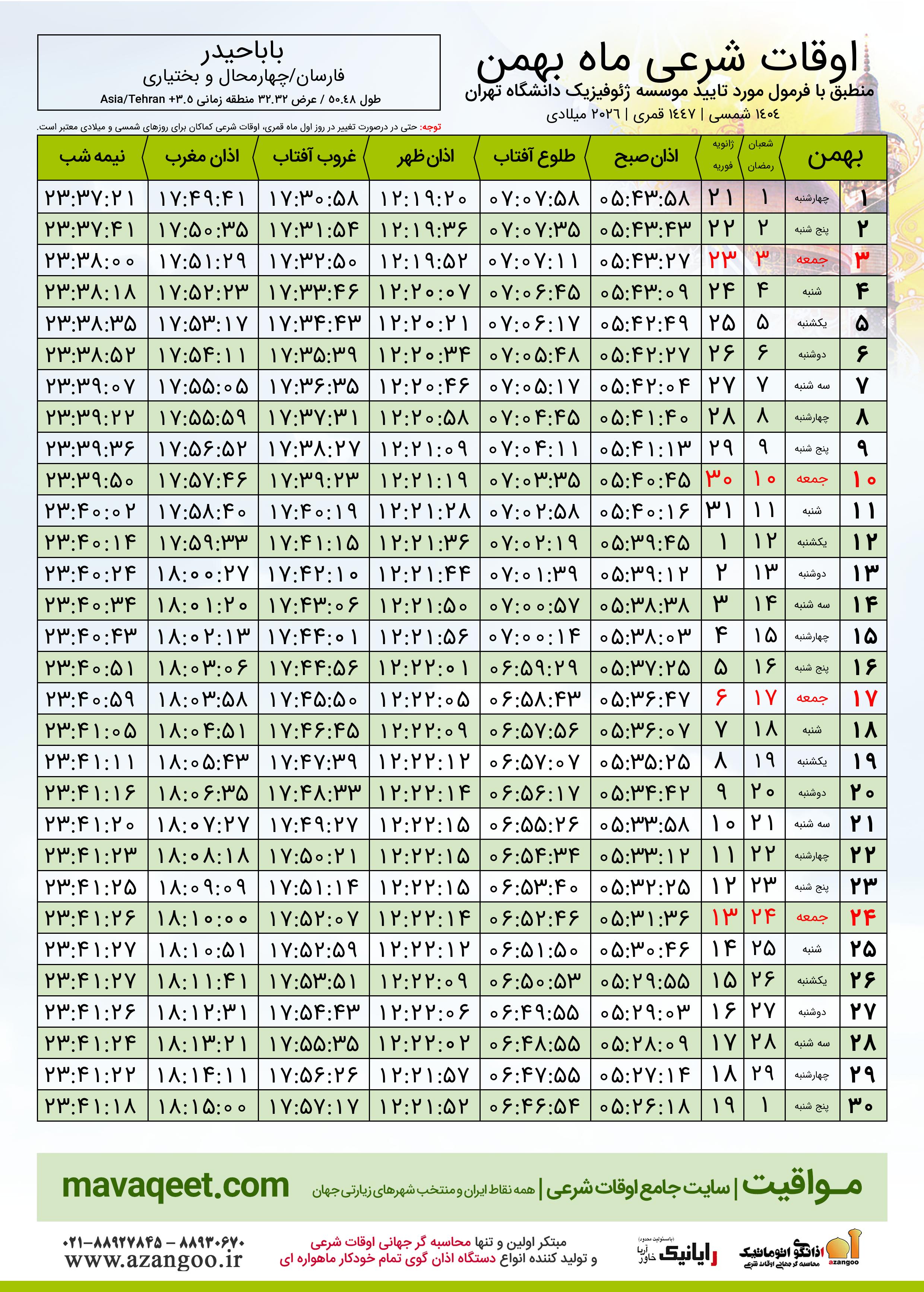 دانلود اوقات شرعی بهمن ٠٤ - ١٤٠٤ شهر باباحیدر