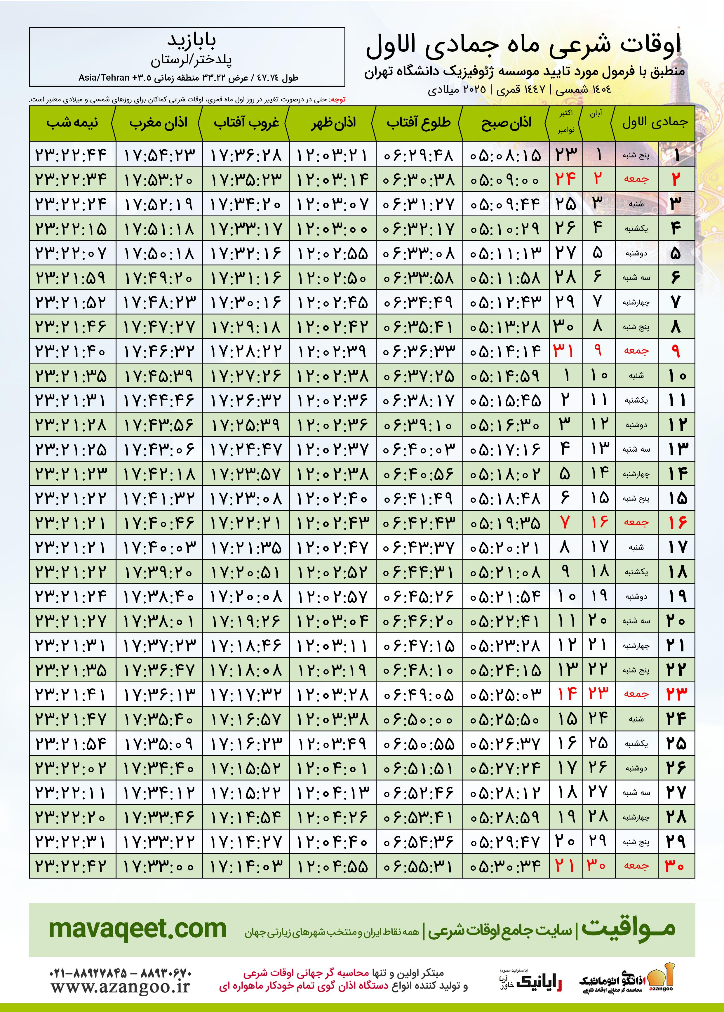 جدول اوقات شرعی جمادی الاول ١٤٤٧ قمری شهر بابازید
