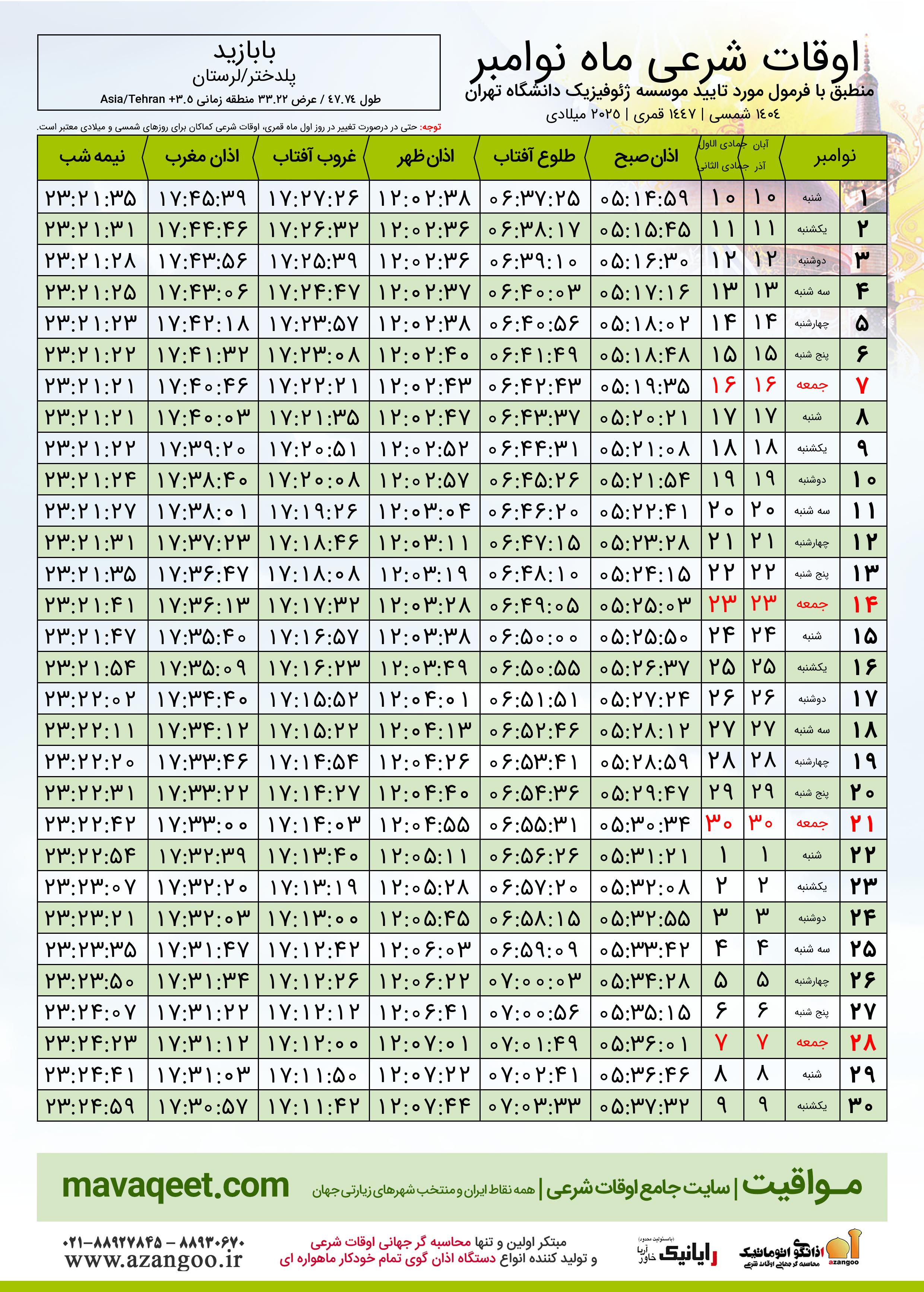 دانلود اوقات شرعی ماه رمضان ٠٤ - ١٤٠٤ شمسی | ٢٠٢٦ میلادی | ١٤٤٧ قمری شهر بابازید