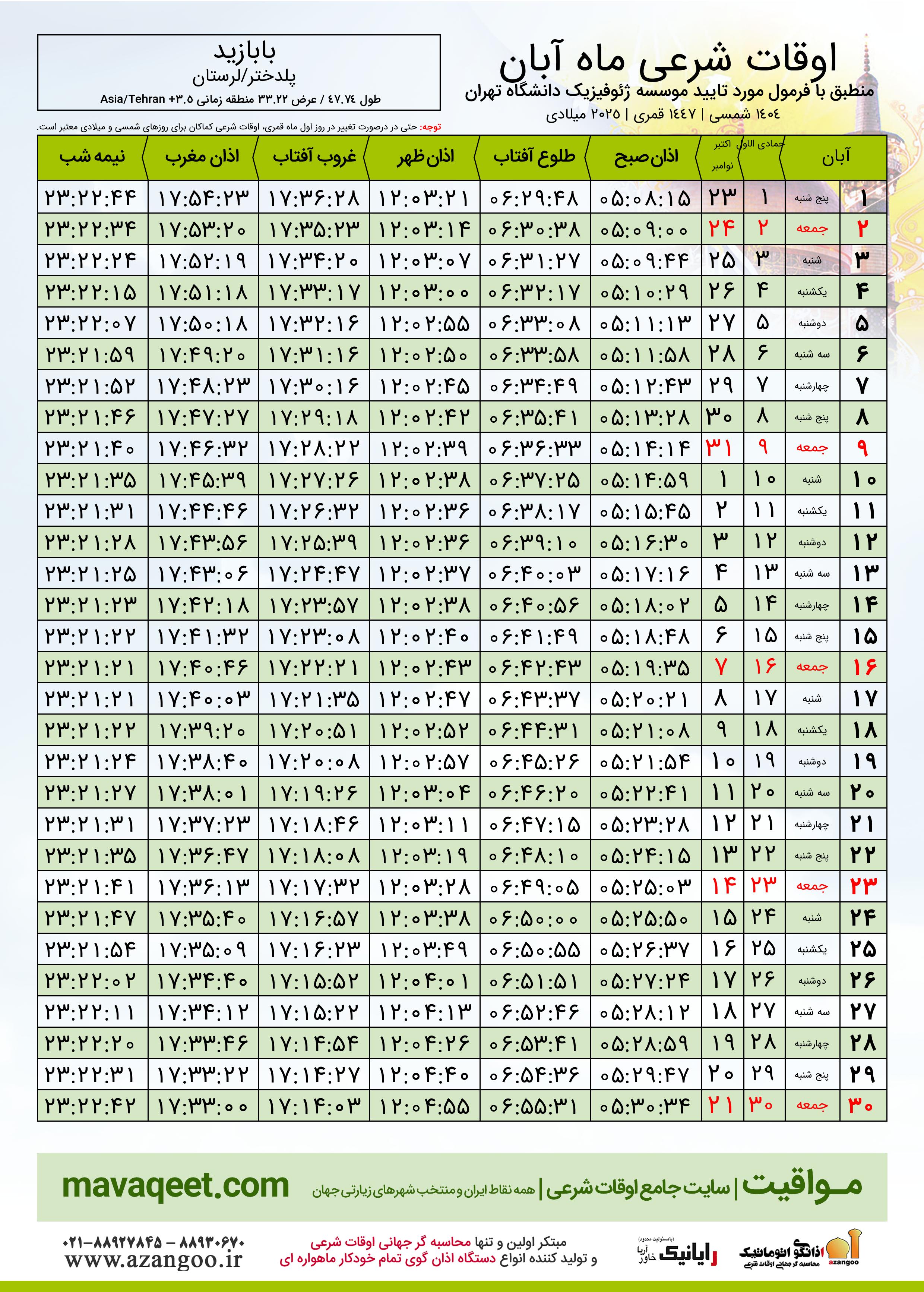 اوقات شرعی آبان ١٤٠٤ شمسی شهر بابازید