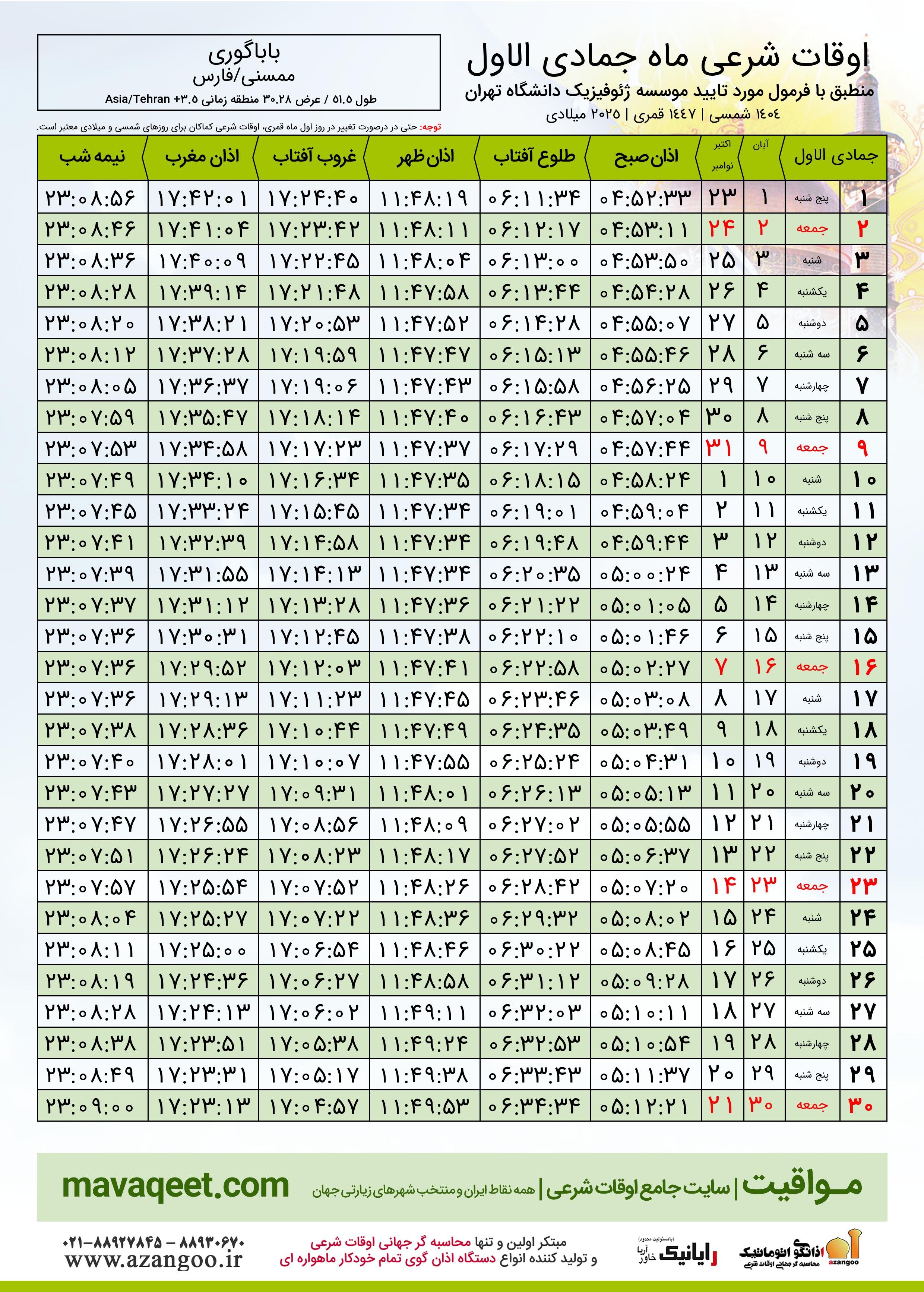 جدول اوقات شرعی جمادی الاول ١٤٤٧ قمری شهر باباگوری