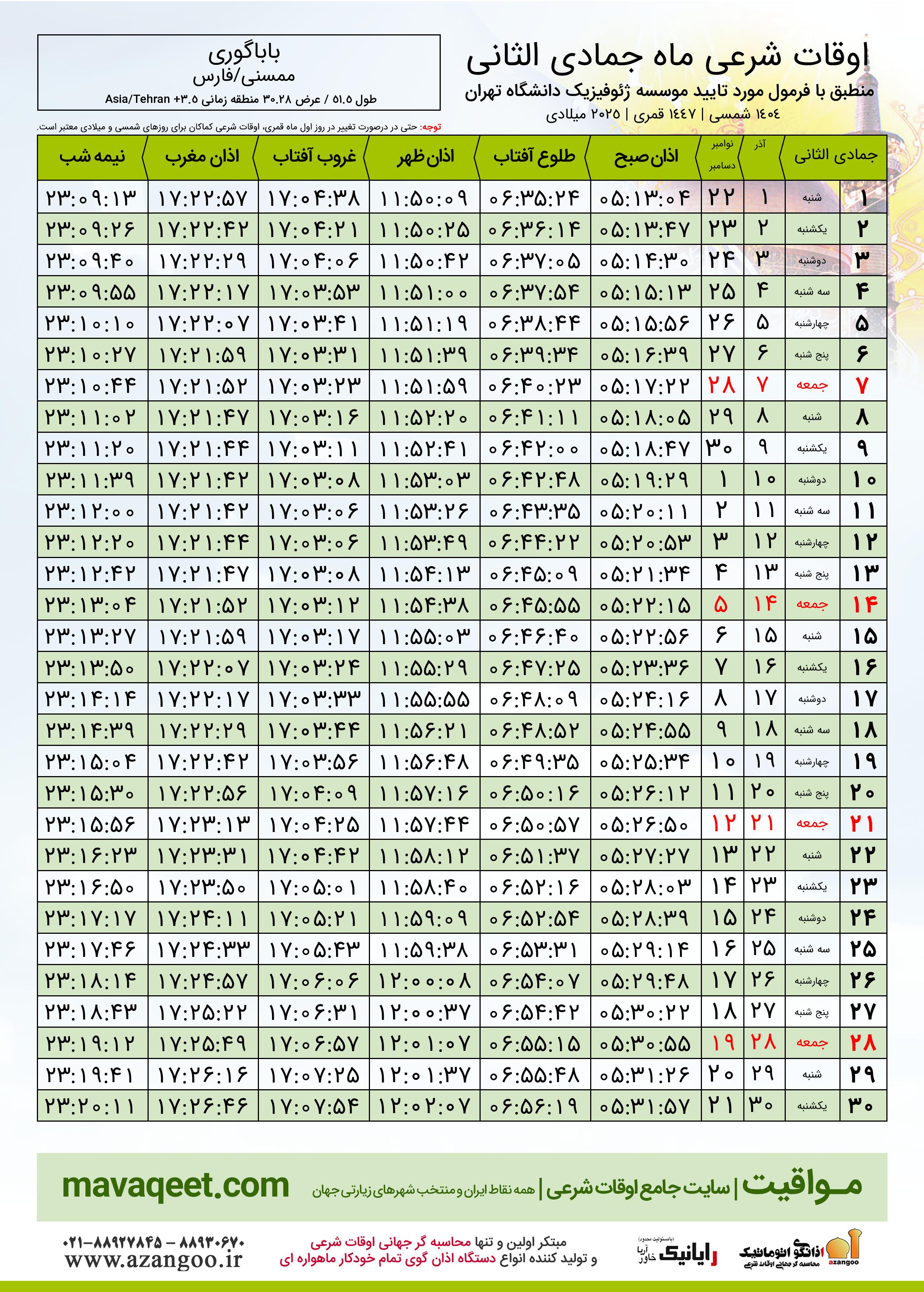 اوقات شرعی ماه جمادی الثانی ١٤٤٧ هـ.ق شهر باباگوری بر