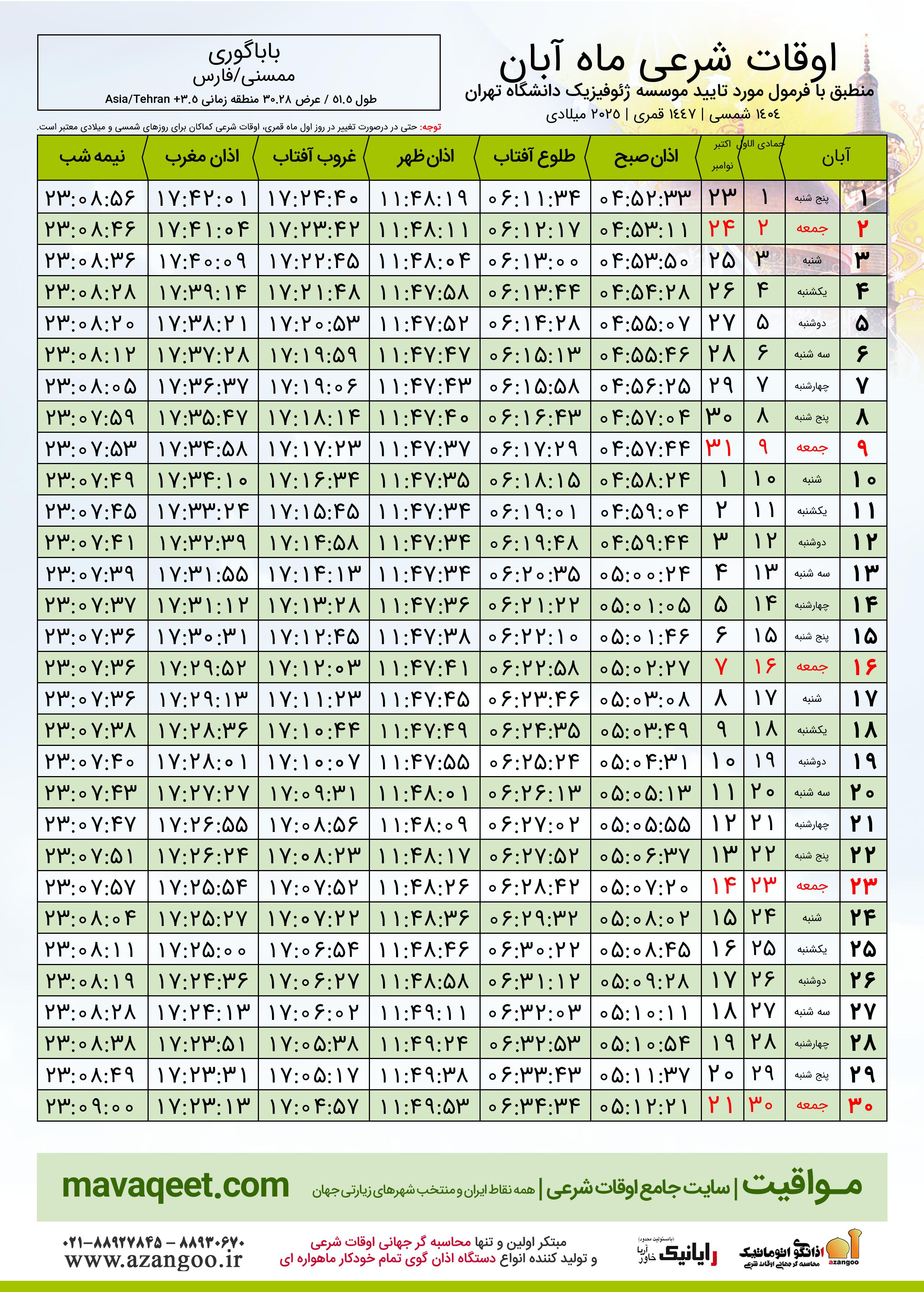 اوقات شرعی آبان ١٤٠٤ شمسی شهر باباگوری