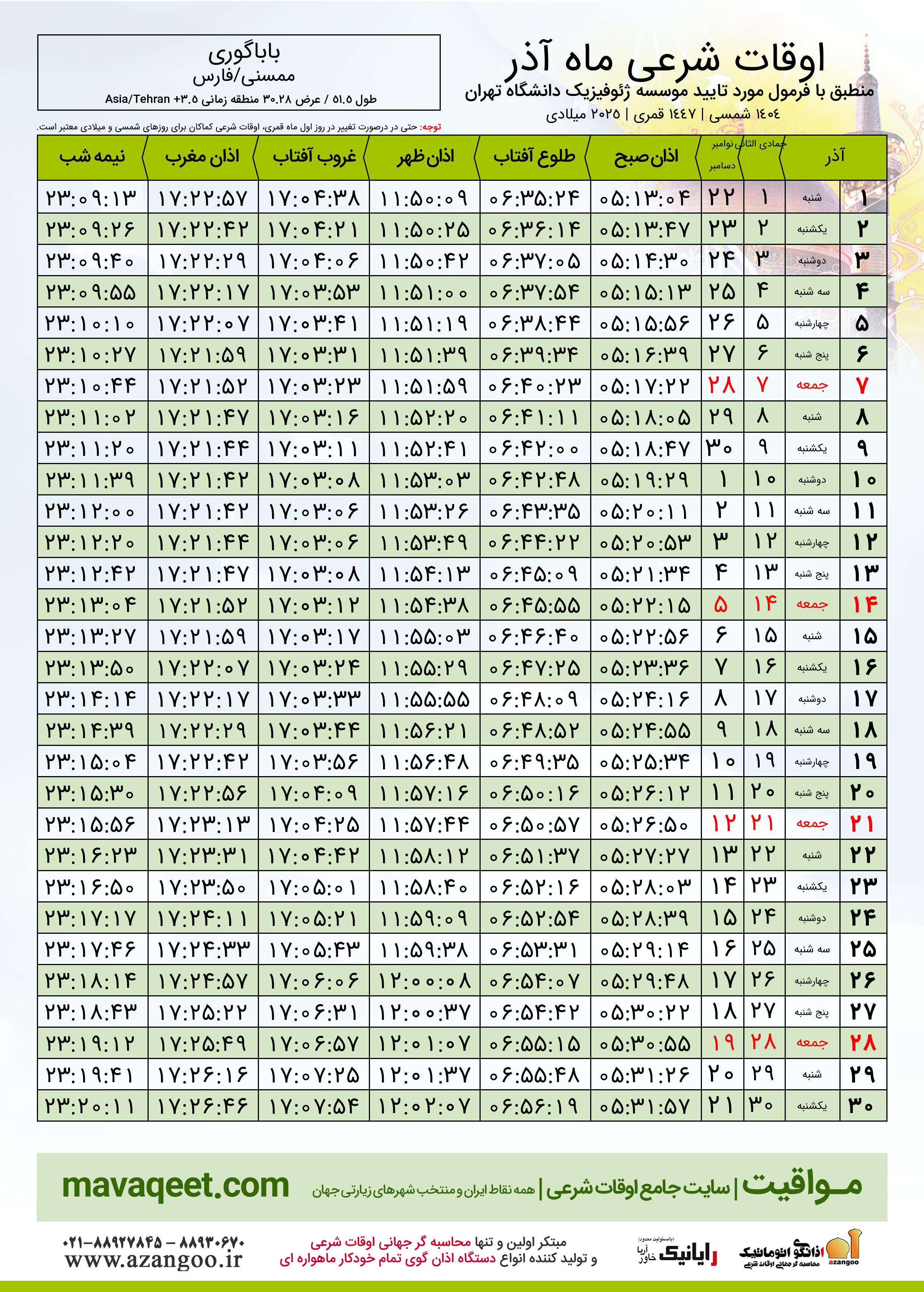 اوقات شرعی آذر ١٤٠٤ شمسی شهر باباگوری