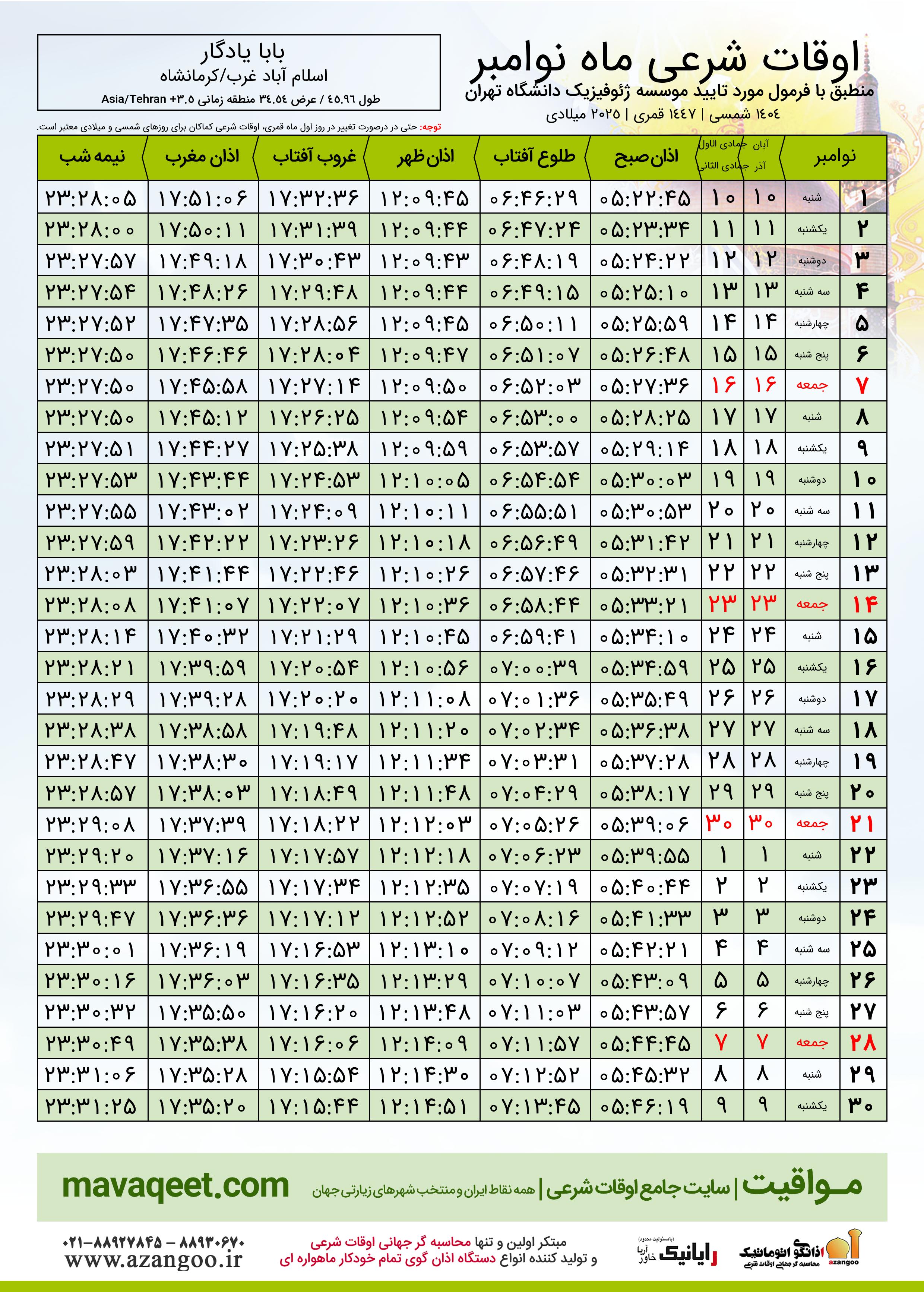 جدول اوقات شرعی نوامبر ٢٠٢٥ میلادی شهر بابا یادگار