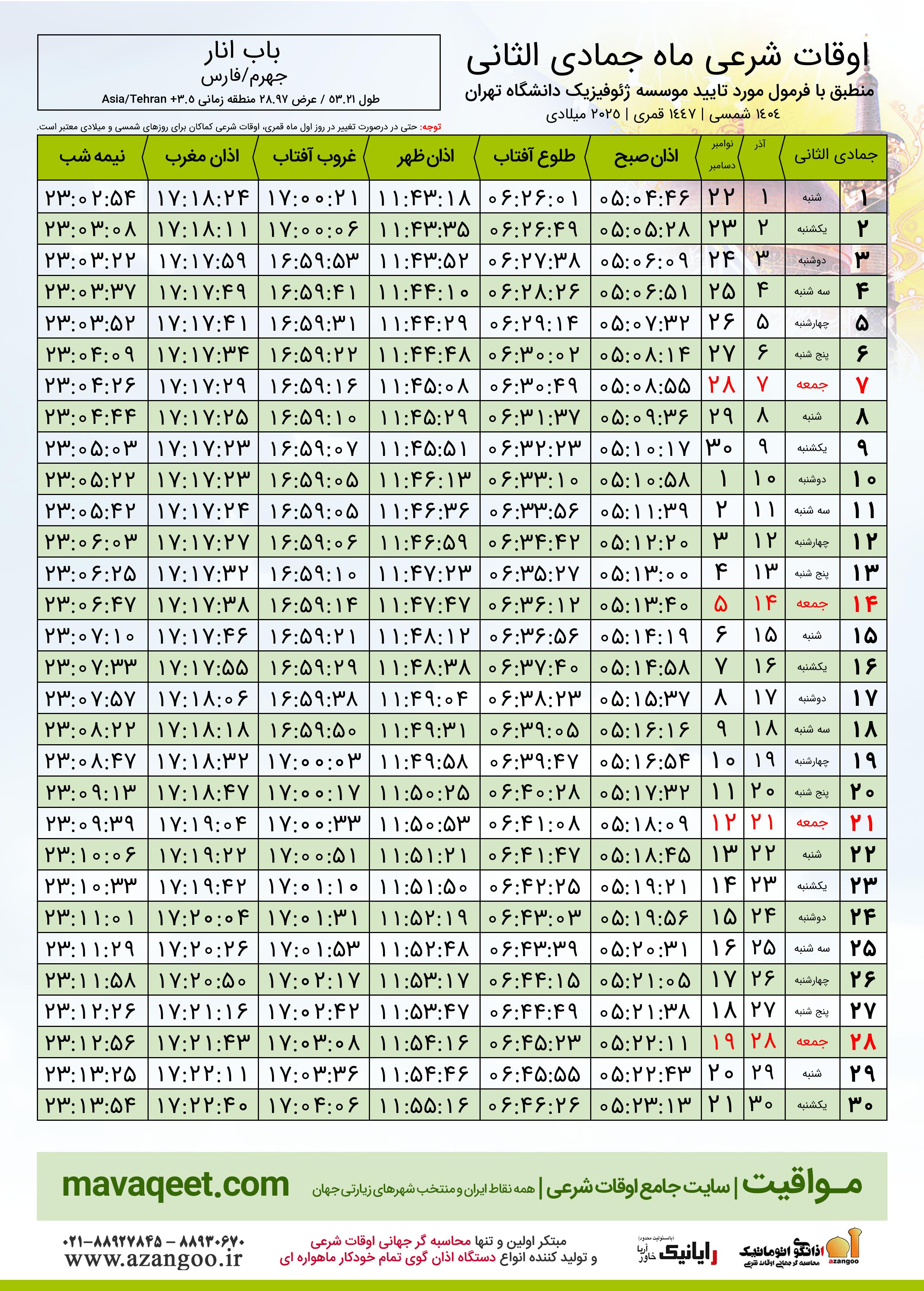جدول اوقات شرعی جمادی الثانی ١٤٤٧ قمری شهر باب انار