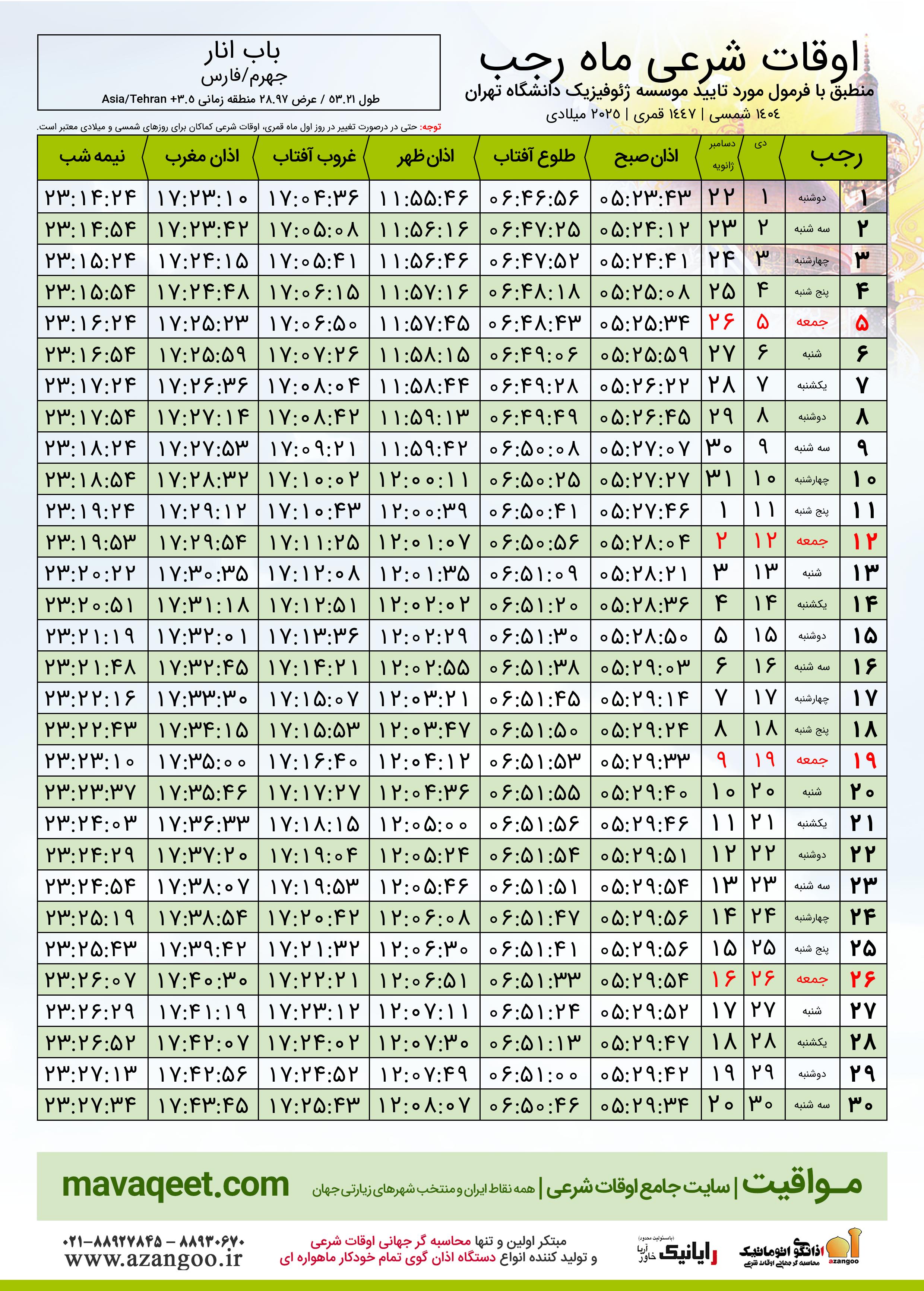 اوقات شرعی ماه رجب ١٤٤٧ هـ.ق شهر باب انار بر