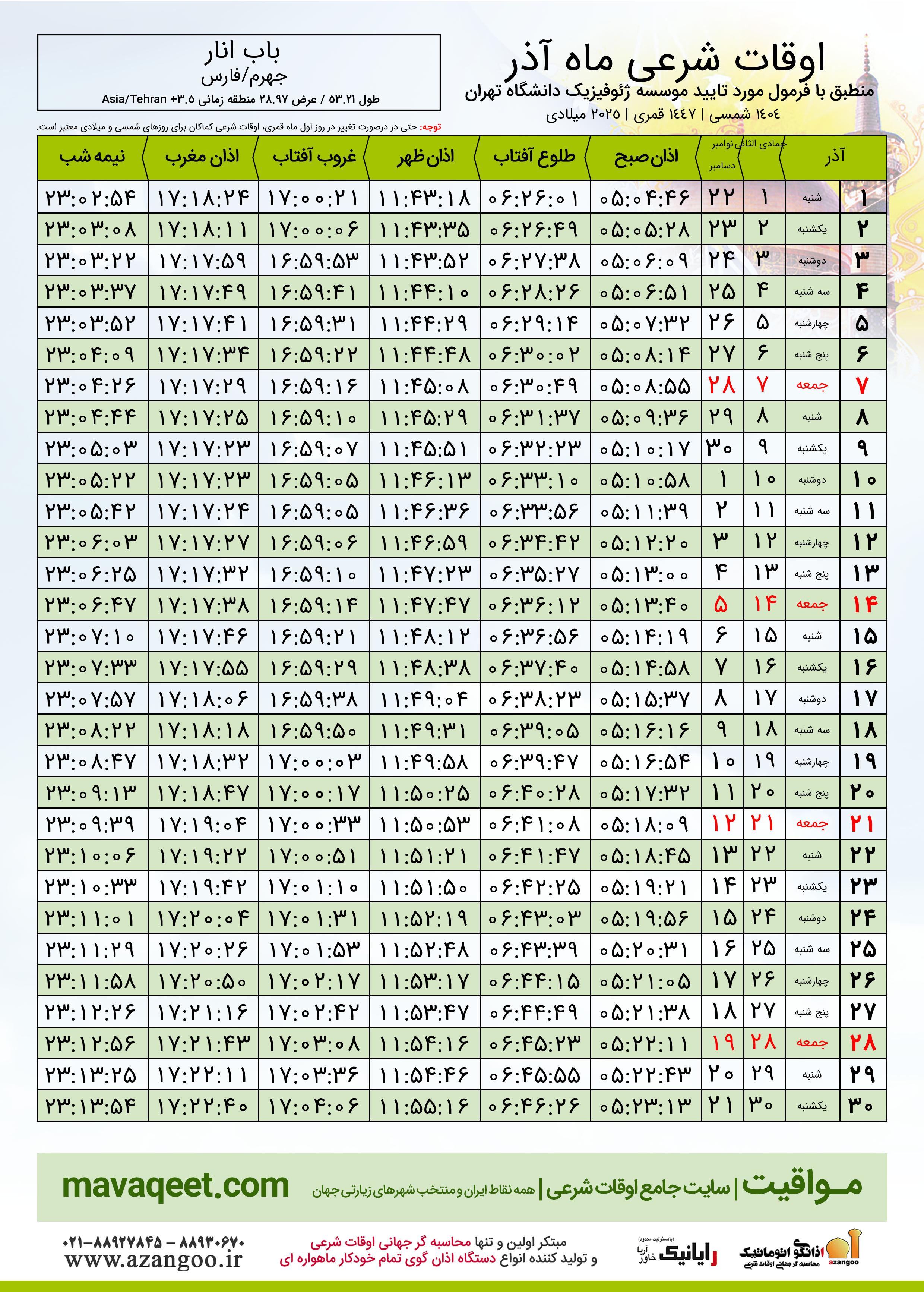 اوقات شرعی آذر ١٤٠٤ شمسی شهر باب انار