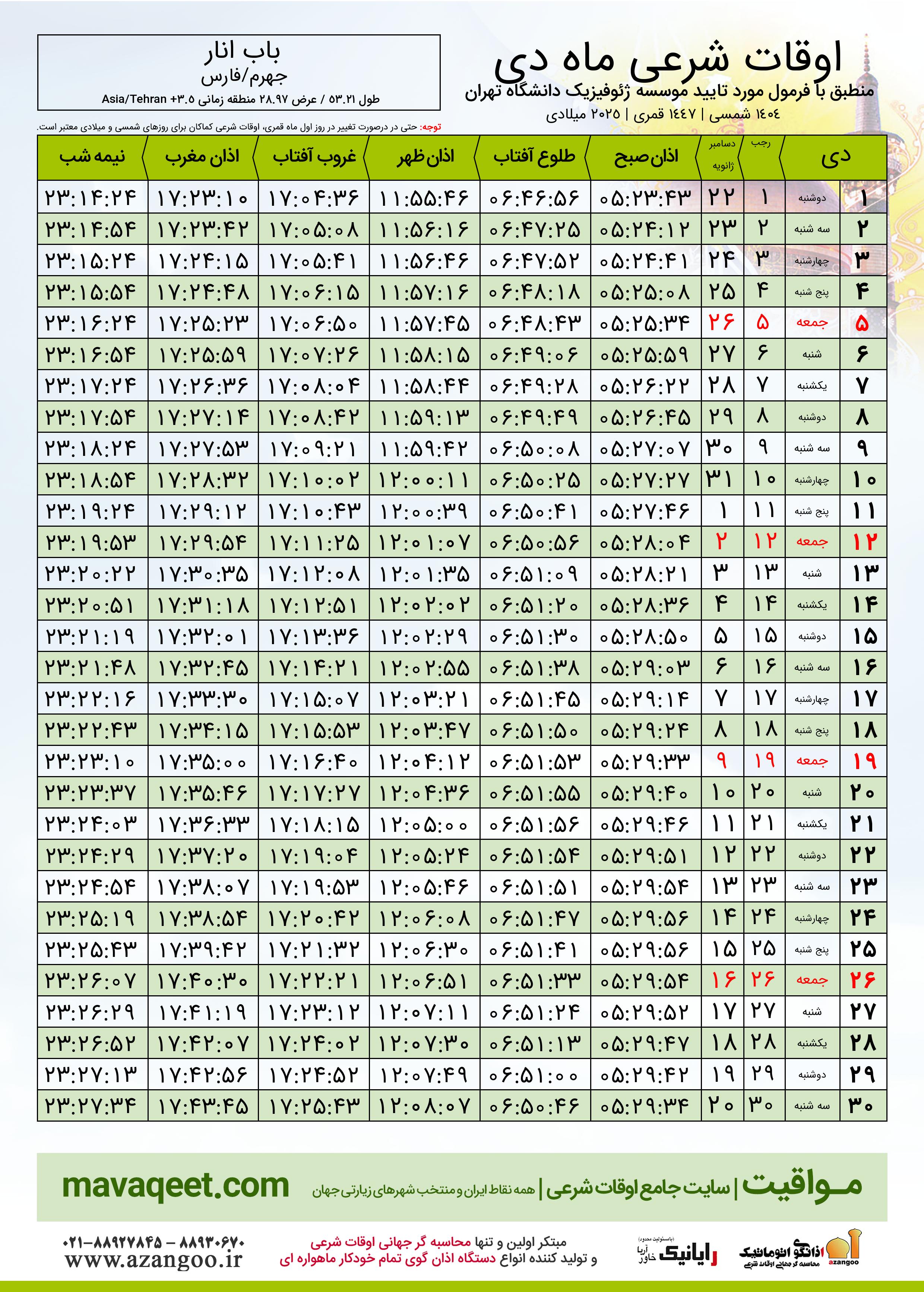 جدول اوقات شرعی دی ١٤٠٤ شمسی شهر باب انار