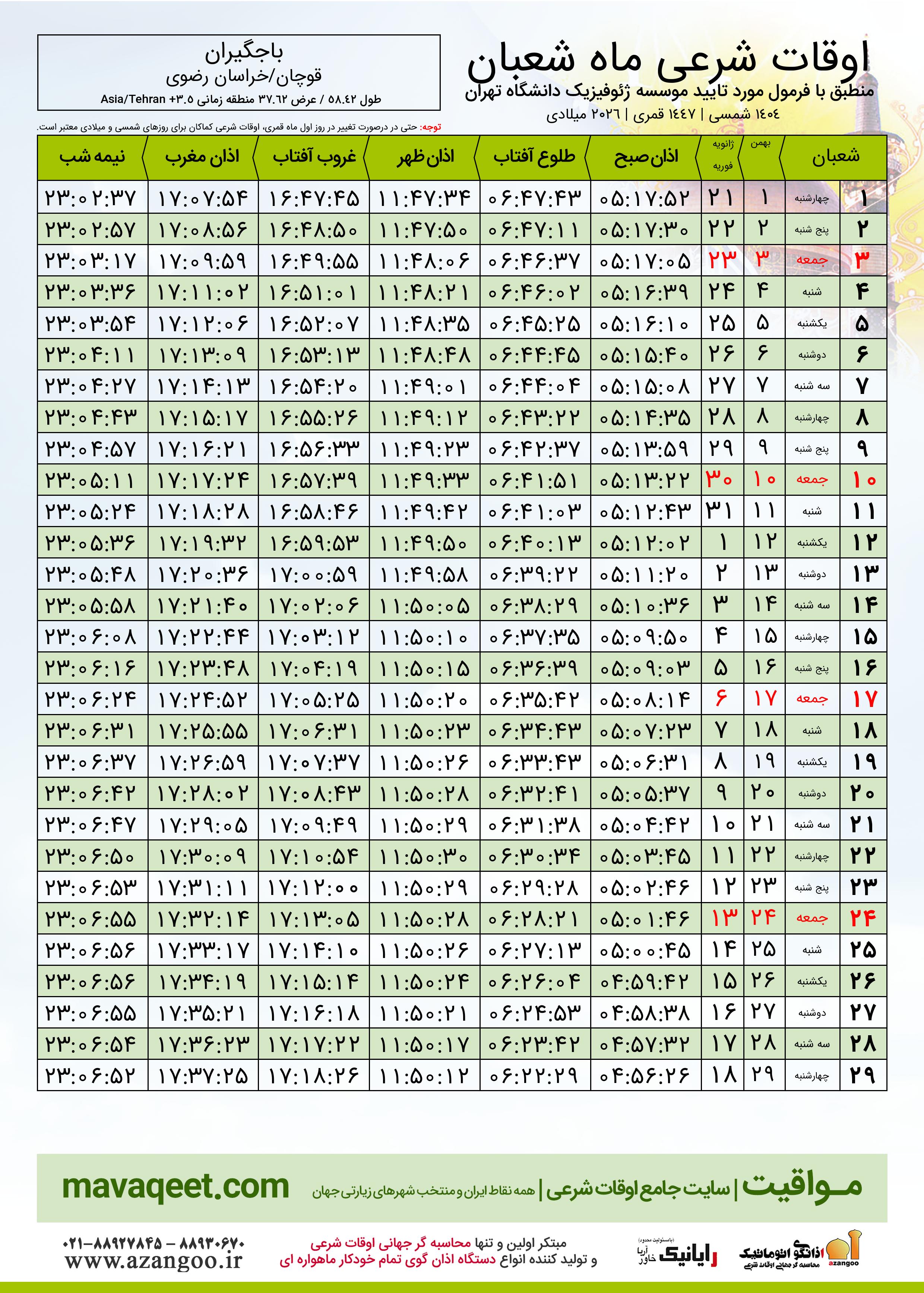 اوقات شرعی ماه شعبان ١٤٤٧ هـ.ق شهر باجگیران بر