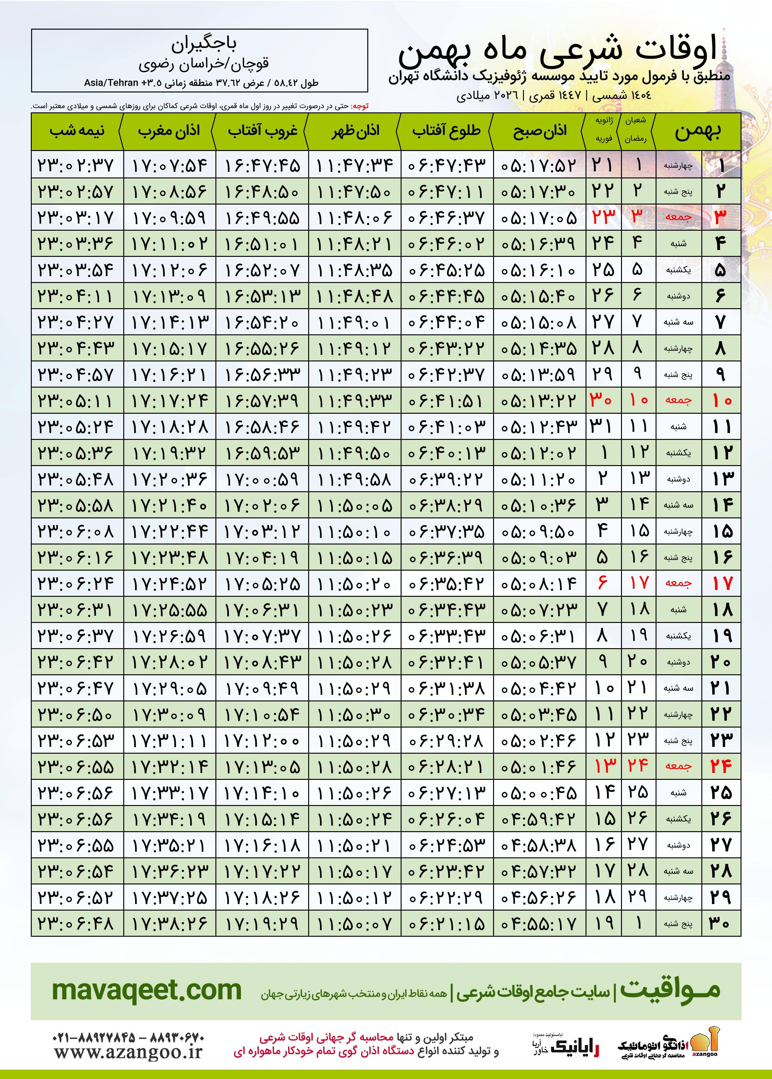 جدول اوقات شرعی فوریه ٢٠٢٦ میلادی شهر باجگیران