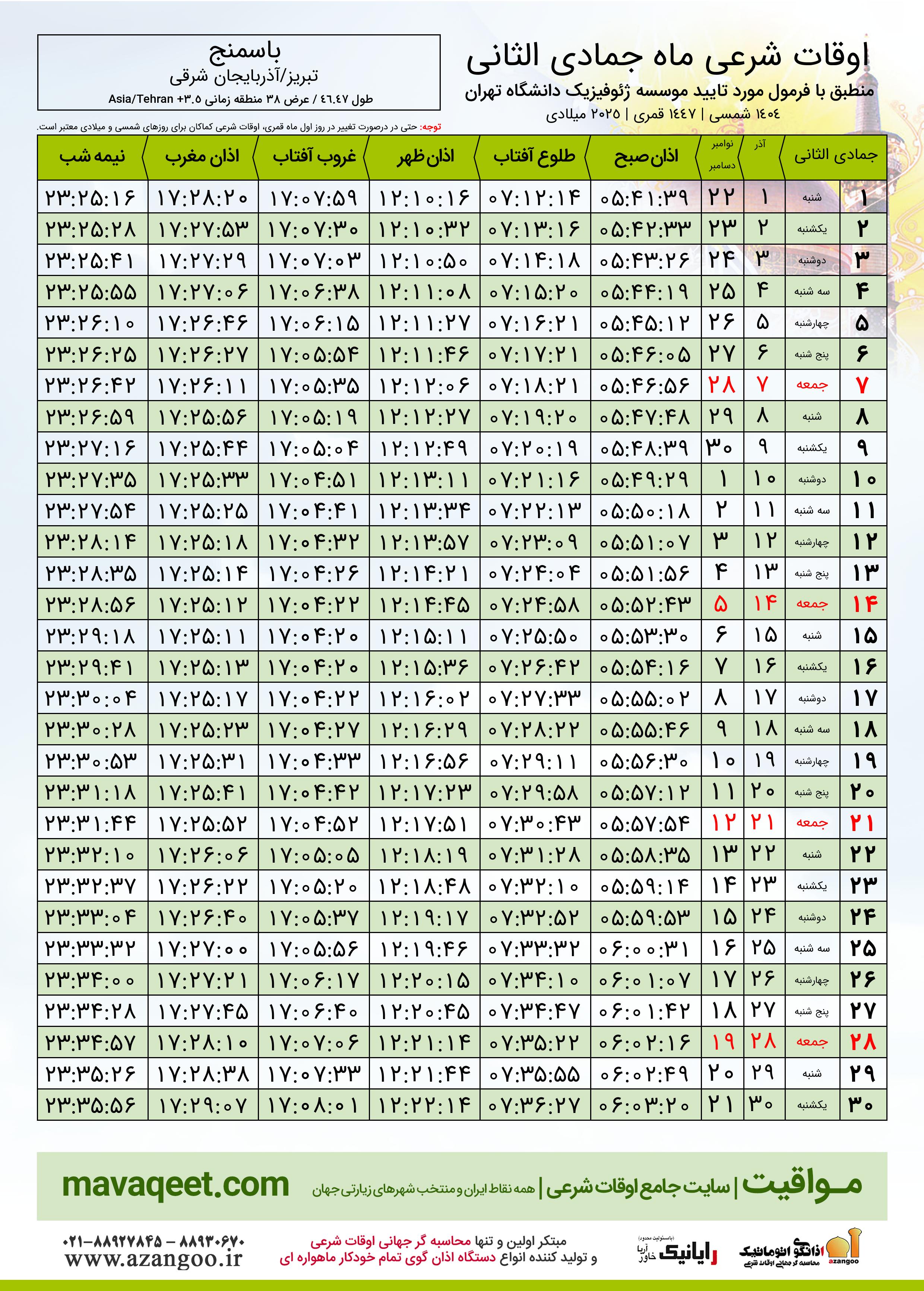 اوقات شرعی ماه جمادی الثانی ١٤٤٧ هـ.ق شهر باسمنج بر