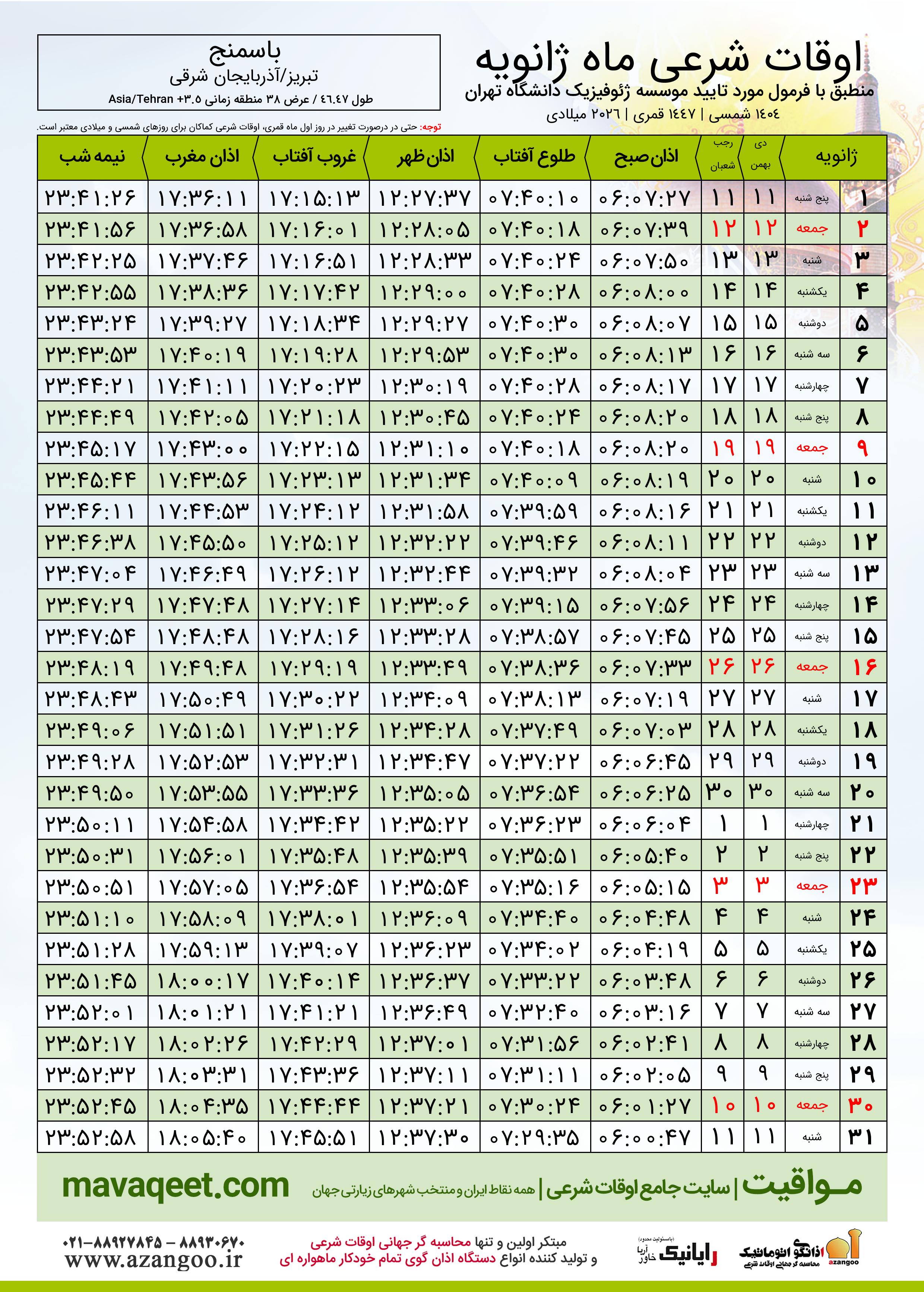 جدول اوقات شرعی شعبان ١٤٤٧ قمری شهر باسمنج