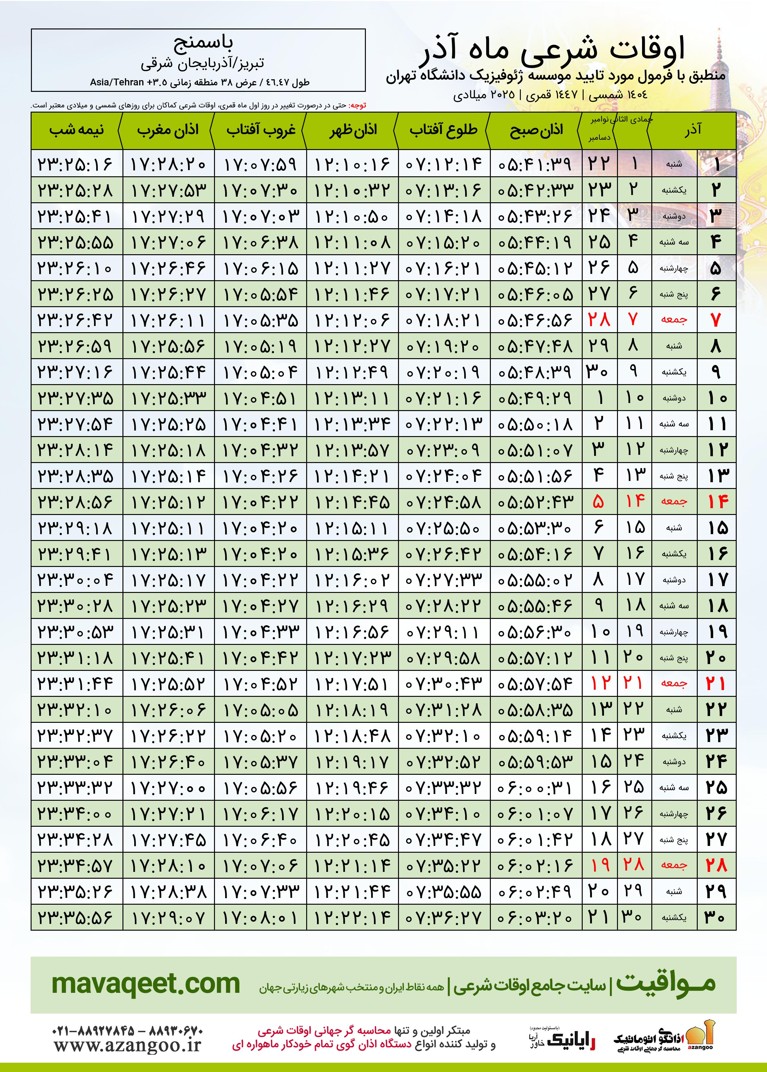 جدول اوقات شرعی آذر ١٤٠٤ شمسی شهر باسمنج