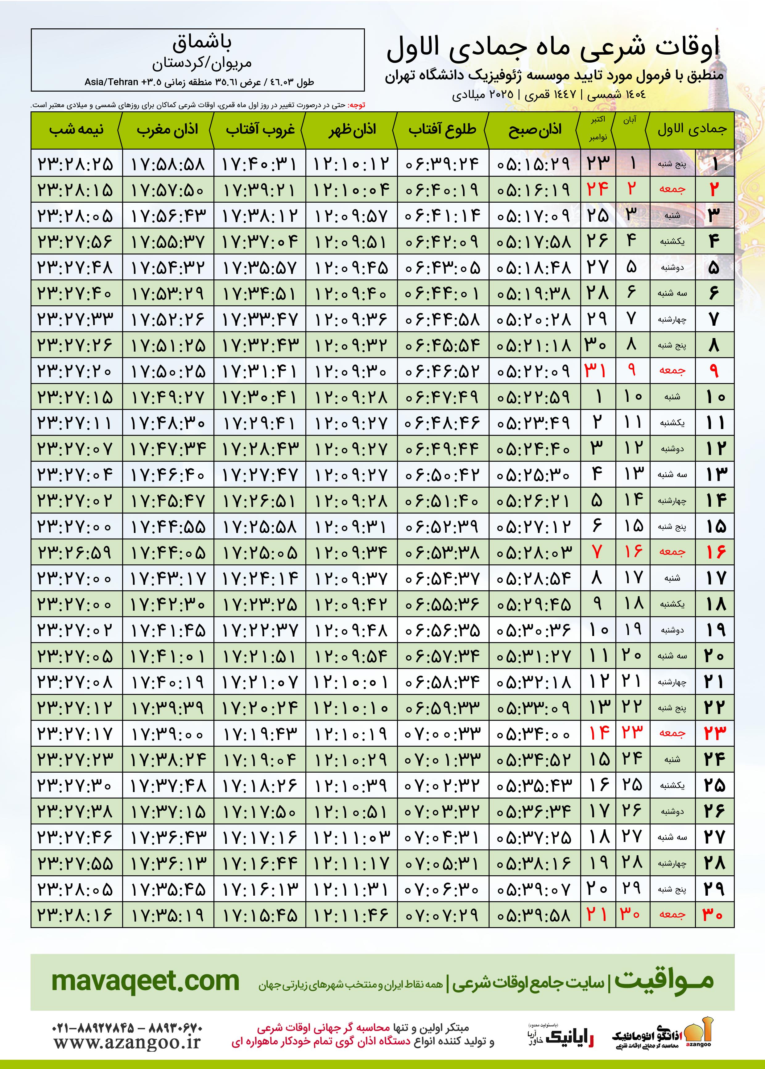 جدول اوقات شرعی جمادی الاول ١٤٤٧ قمری شهر باشماق