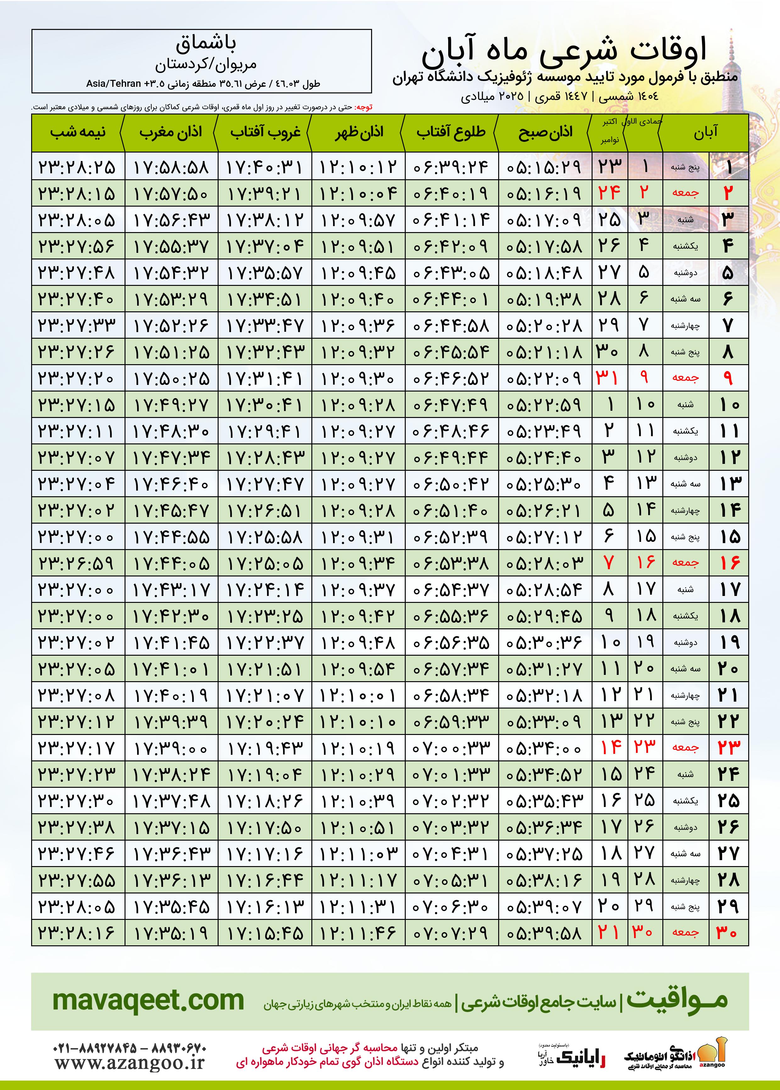 جدول اوقات شرعی آبان ١٤٠٤ شمسی شهر باشماق
