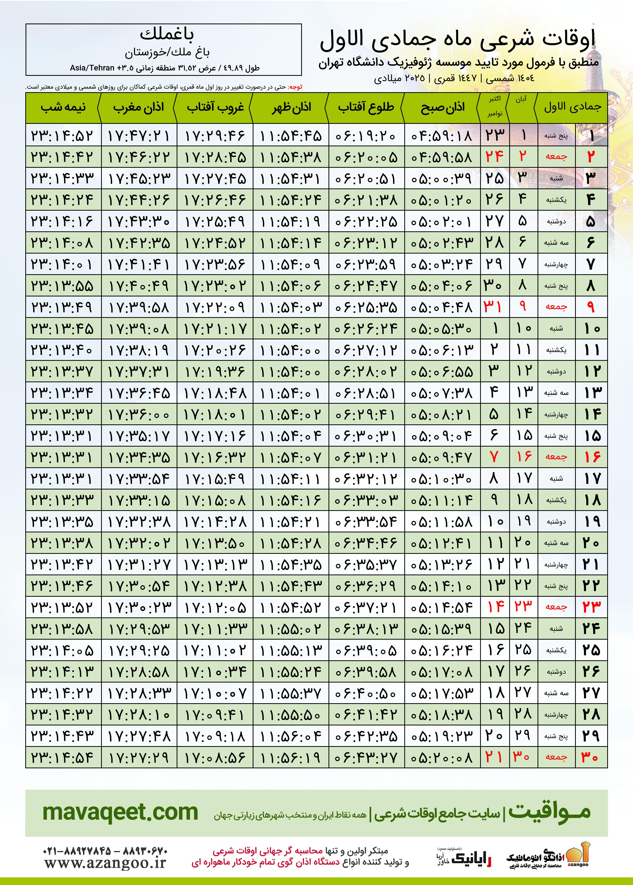 جهت نمایش تصویر جدول اوقات شرعی ماه جمادی الاول ١٤٤٧ هـ.ق شهر باغملک در اندازه واقعی و با کیفیت بالا بر روی تصویر پیش نمایش کلیک نمایید.