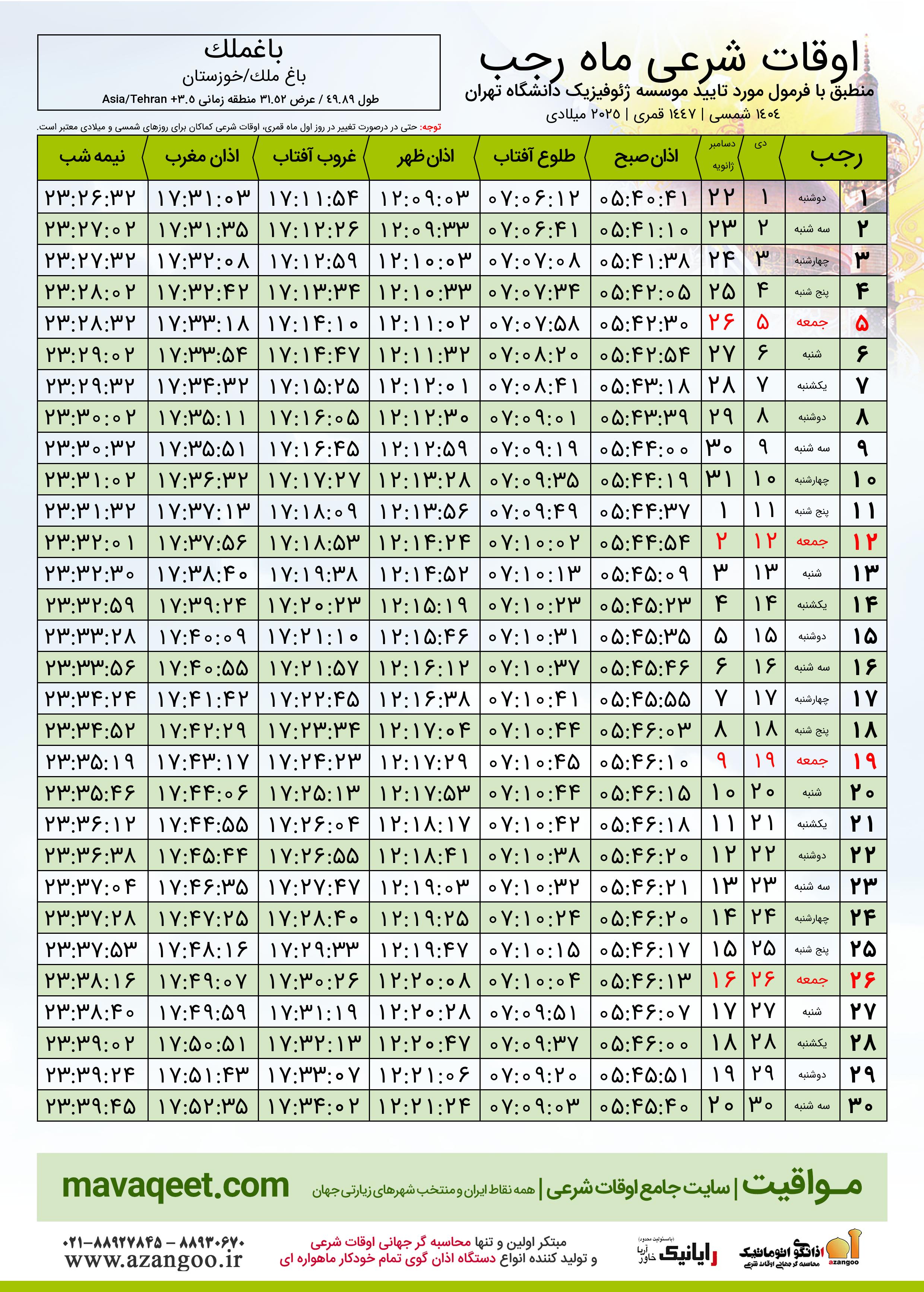 اوقات شرعی ماه رجب ١٤٤٧ هـ.ق شهر باغملک بر