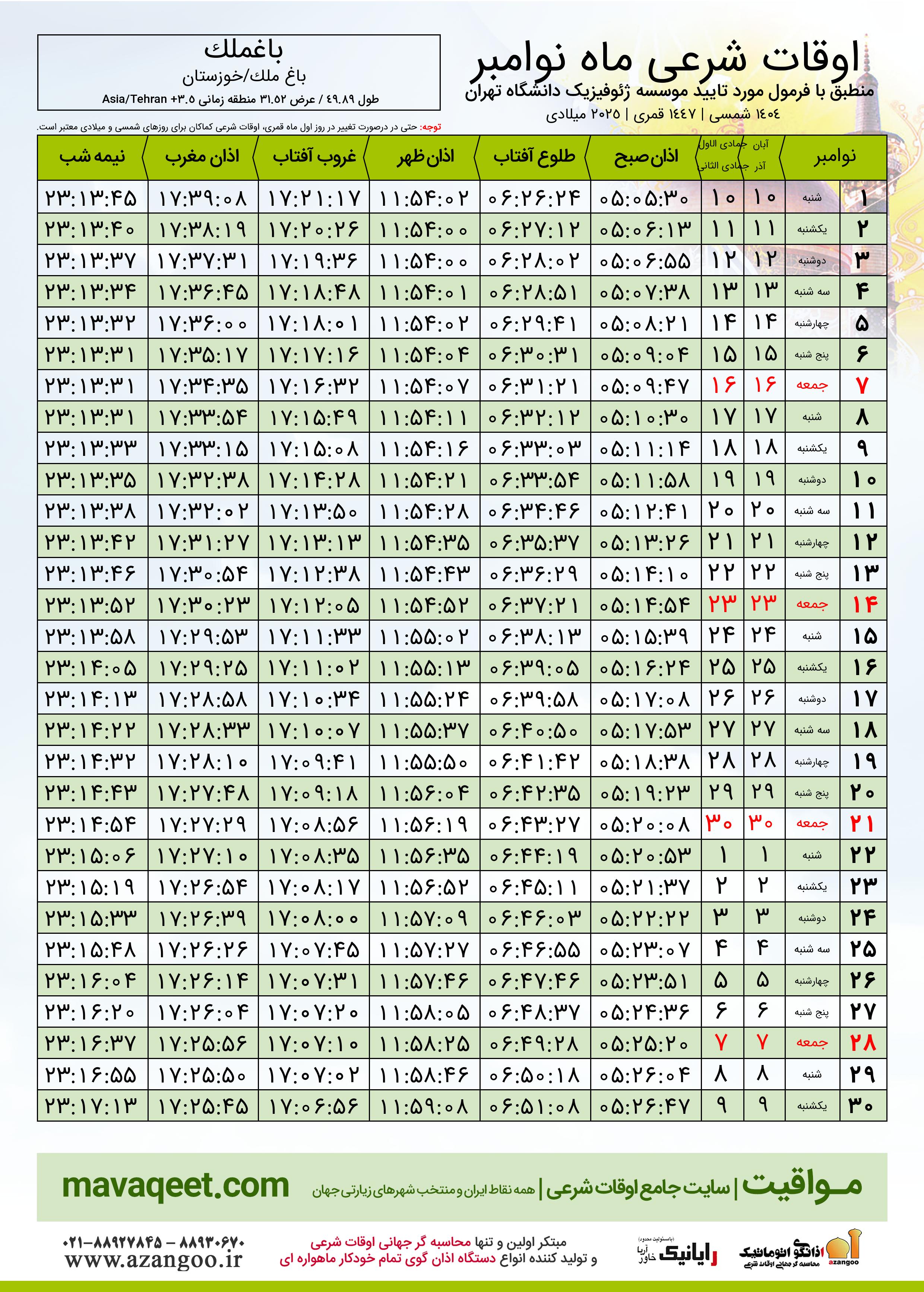 اوقات شرعی نوامبر ٢٠٢٥ شهر باغملک + دانلود