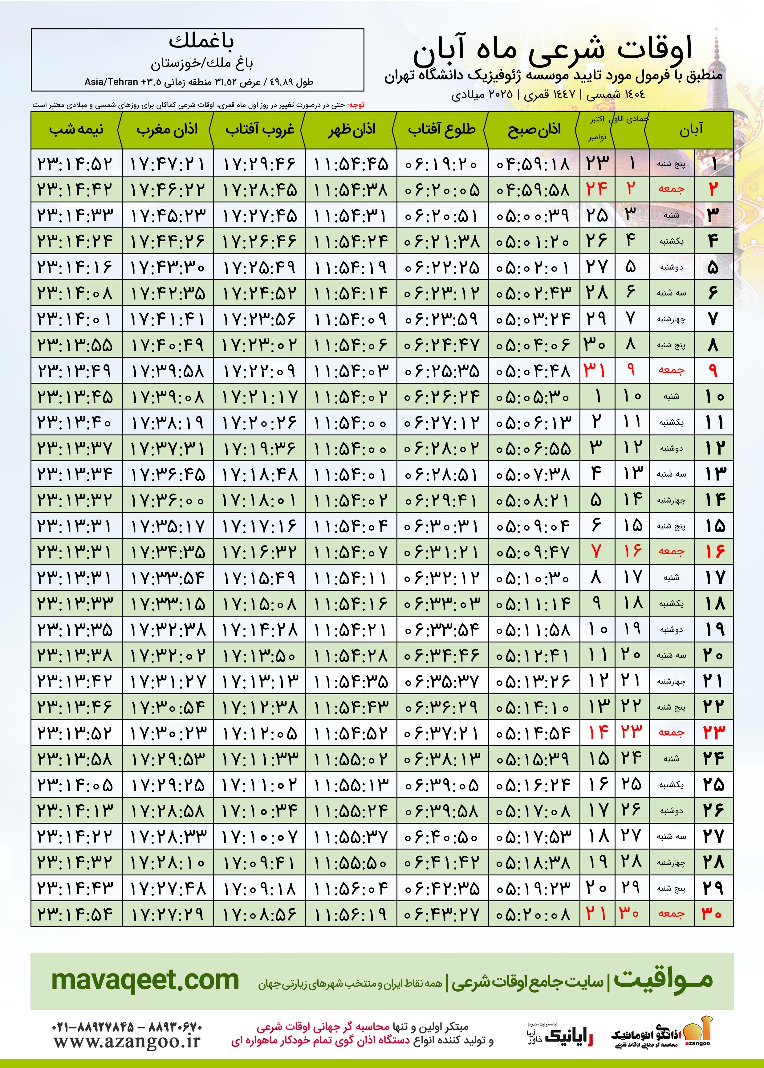 جدول اوقات شرعی آبان ٠٤ / ١٤٠٤ باغملک دانلود pdf