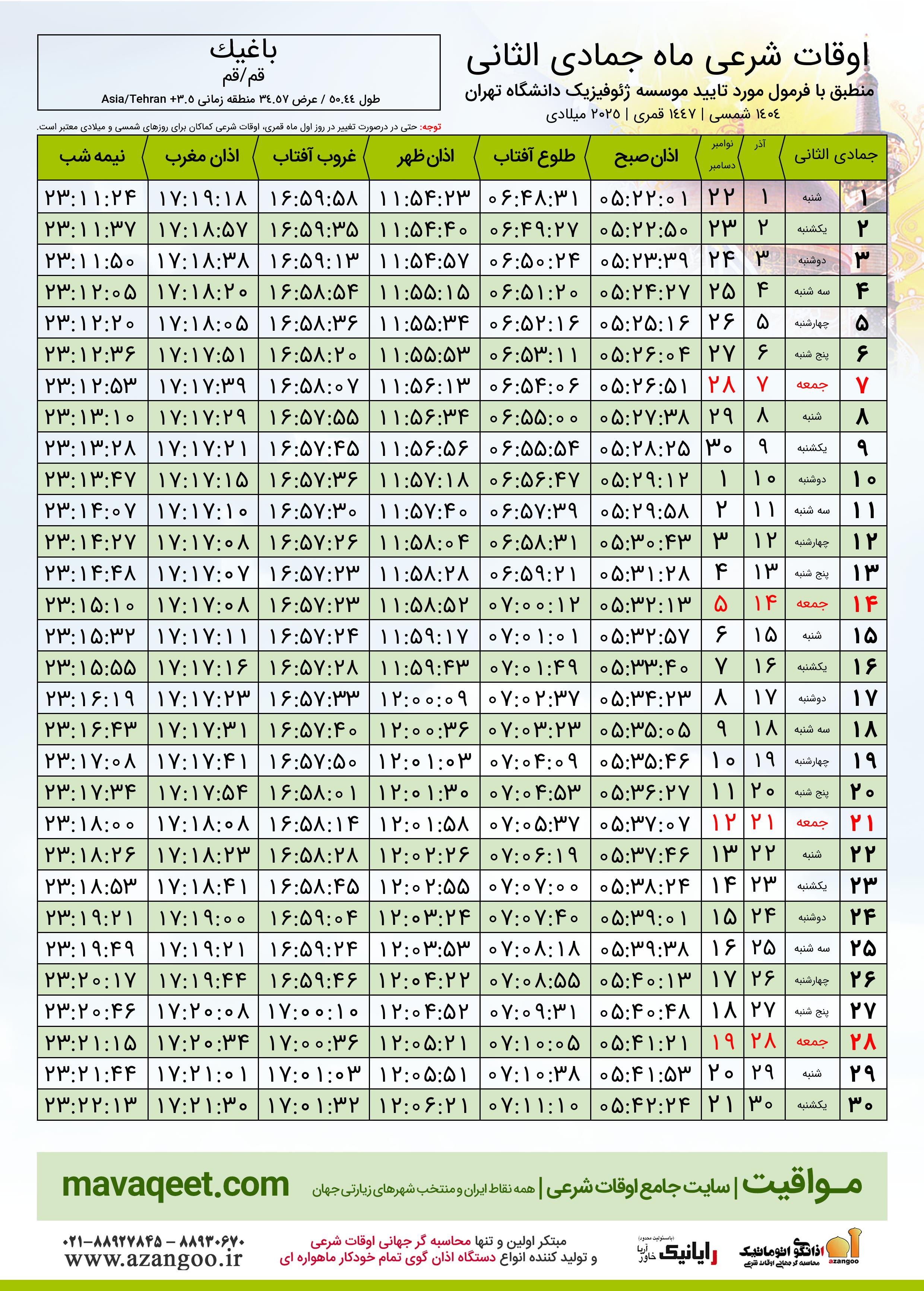 اوقات شرعی ماه جمادی الثانی ١٤٤٧ هـ.ق شهر باغیک بر