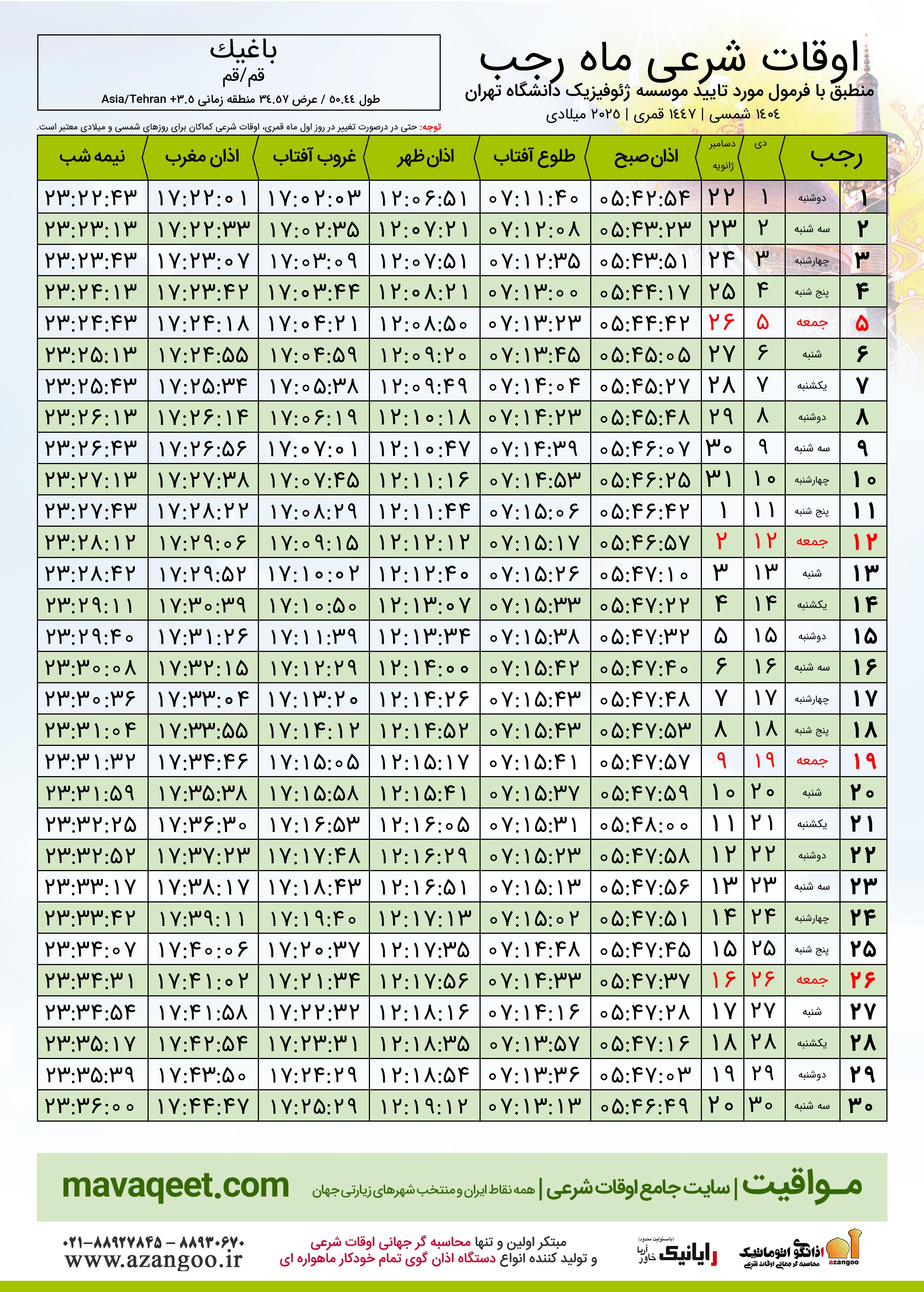 اوقات شرعی ماه رجب ١٤٤٧ هـ.ق شهر باغیک بر