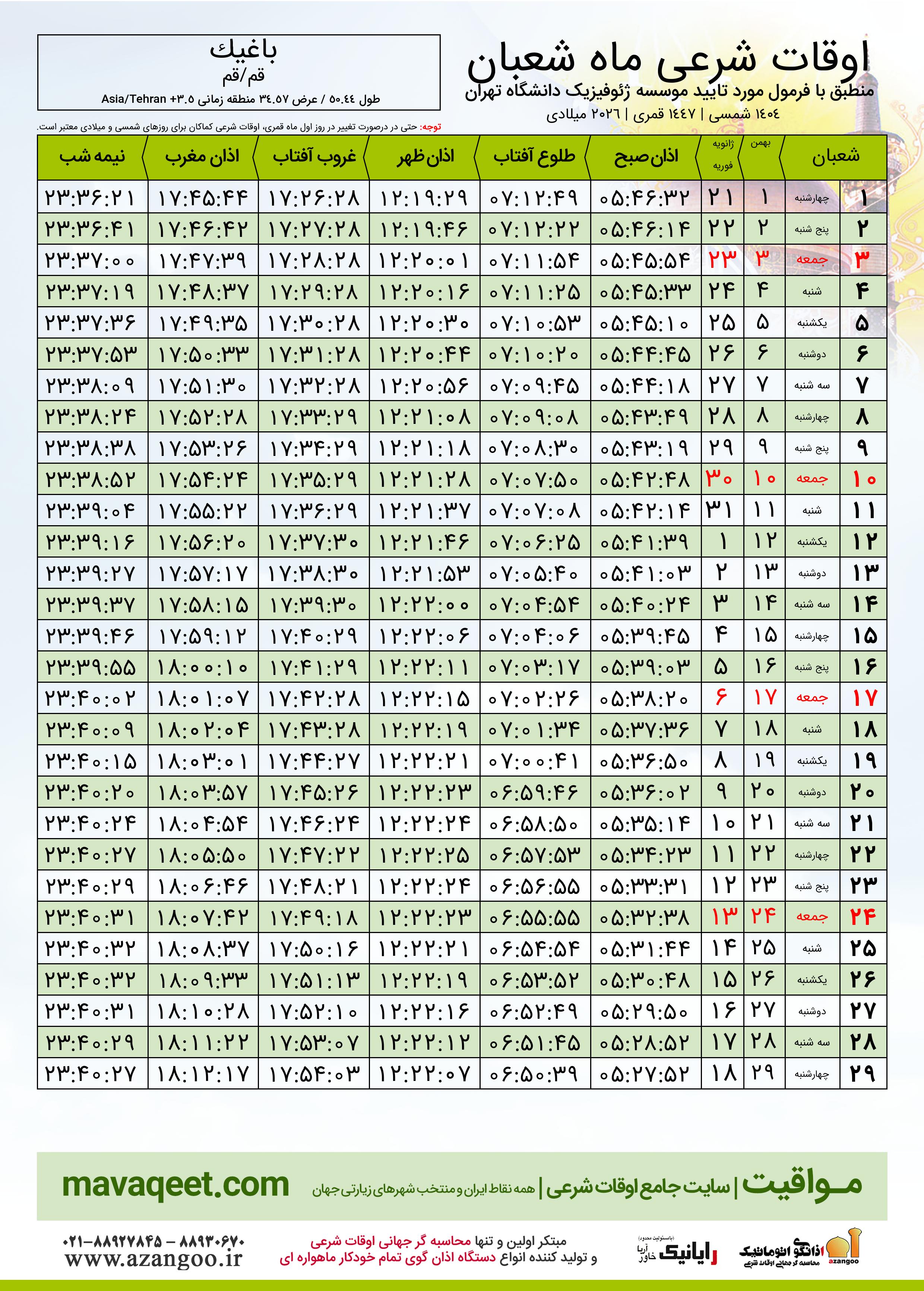اوقات شرعی ماه شعبان ١٤٤٧ هـ.ق شهر باغیک بر