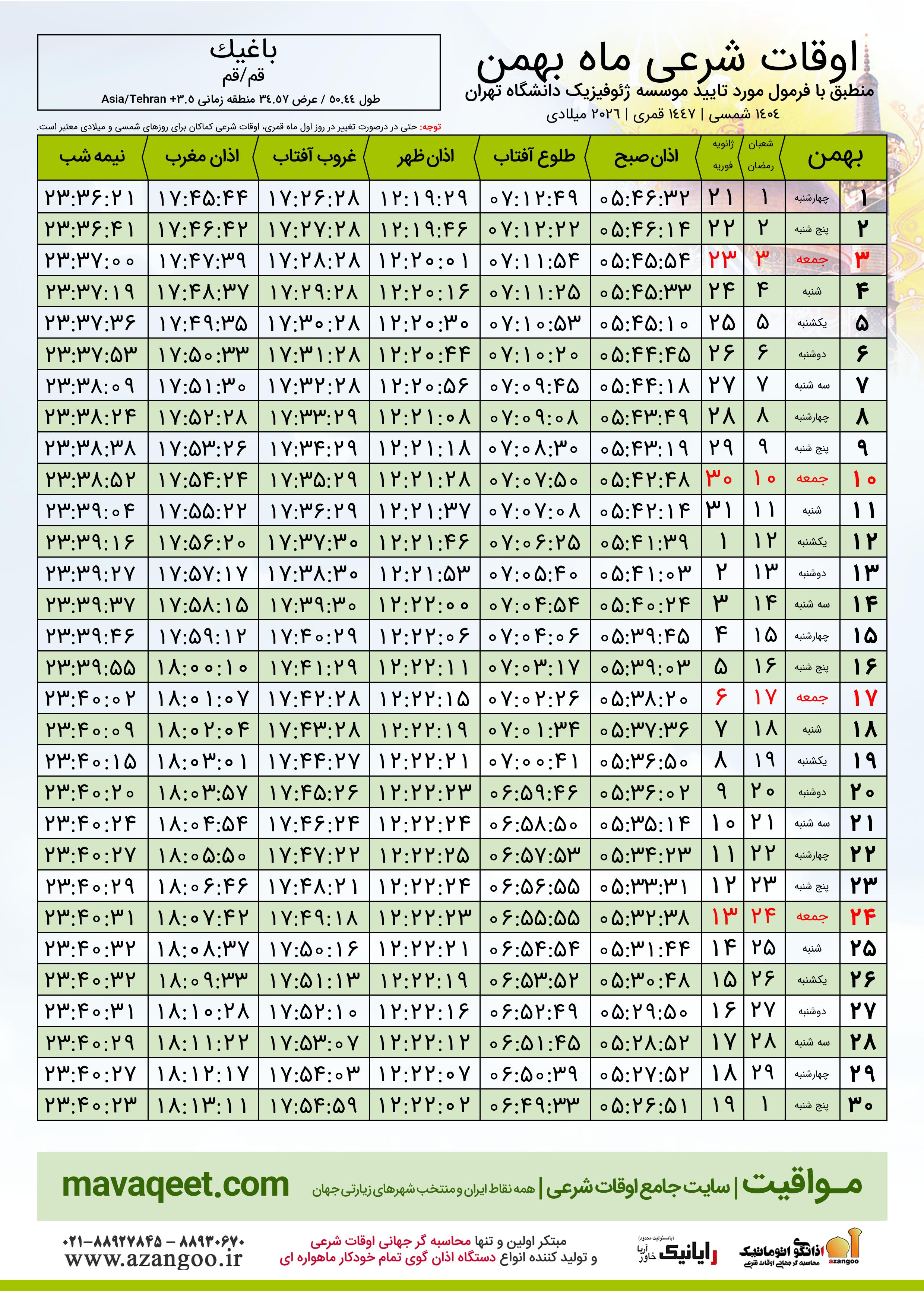 دانلود اوقات شرعی بهمن ٠٤ - ١٤٠٤ شهر باغیک