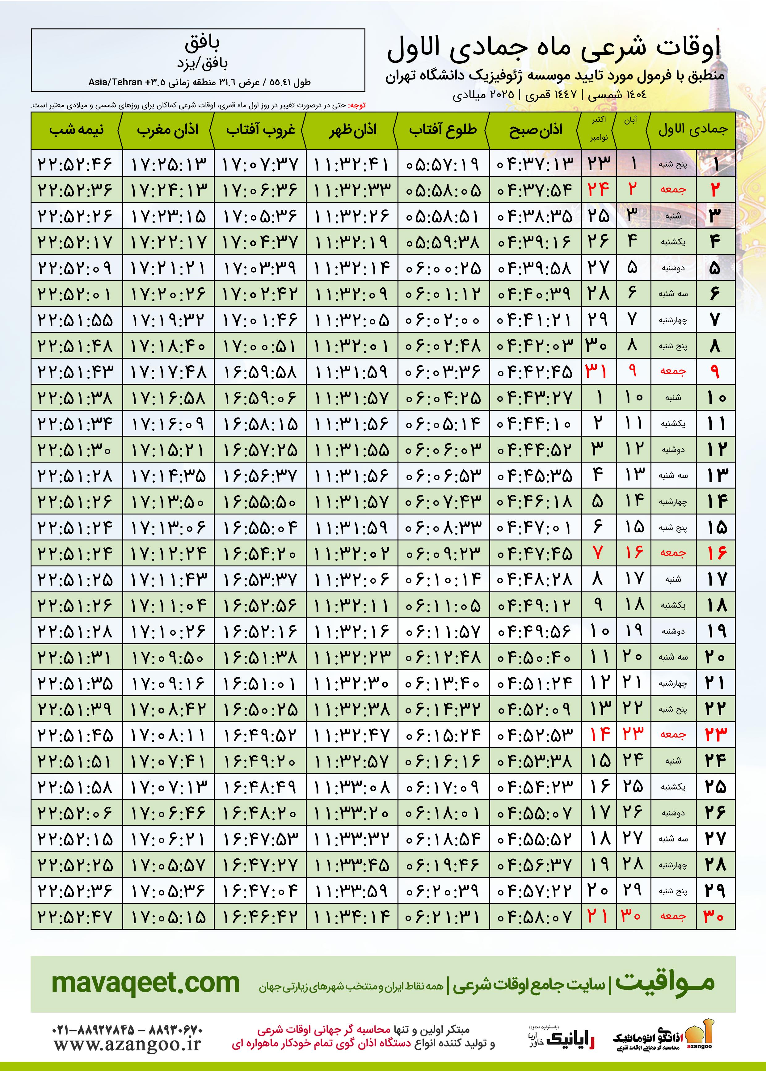اوقات شرعی ماه جمادی الاول ١٤٤٧ هـ.ق شهر بافق بر